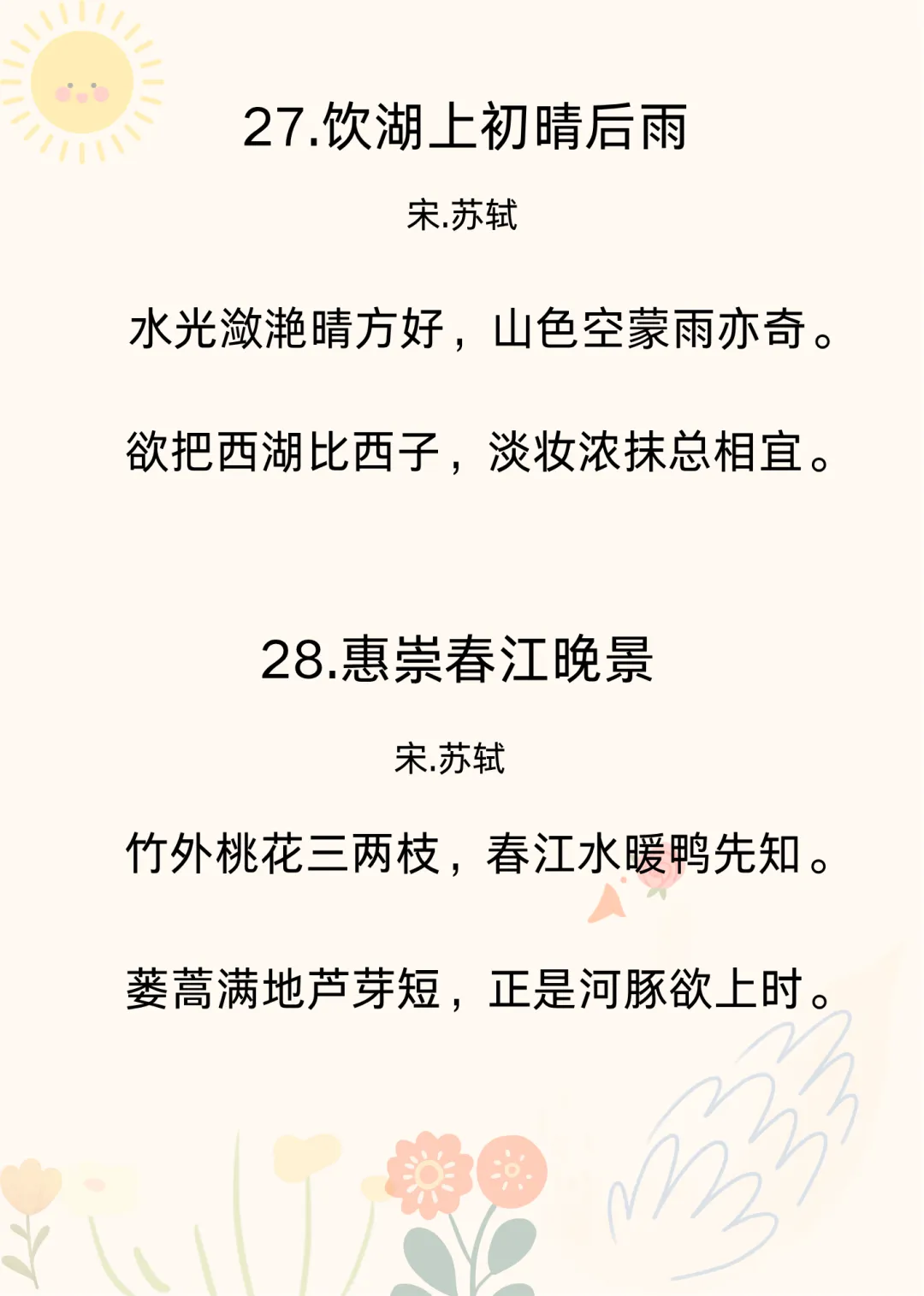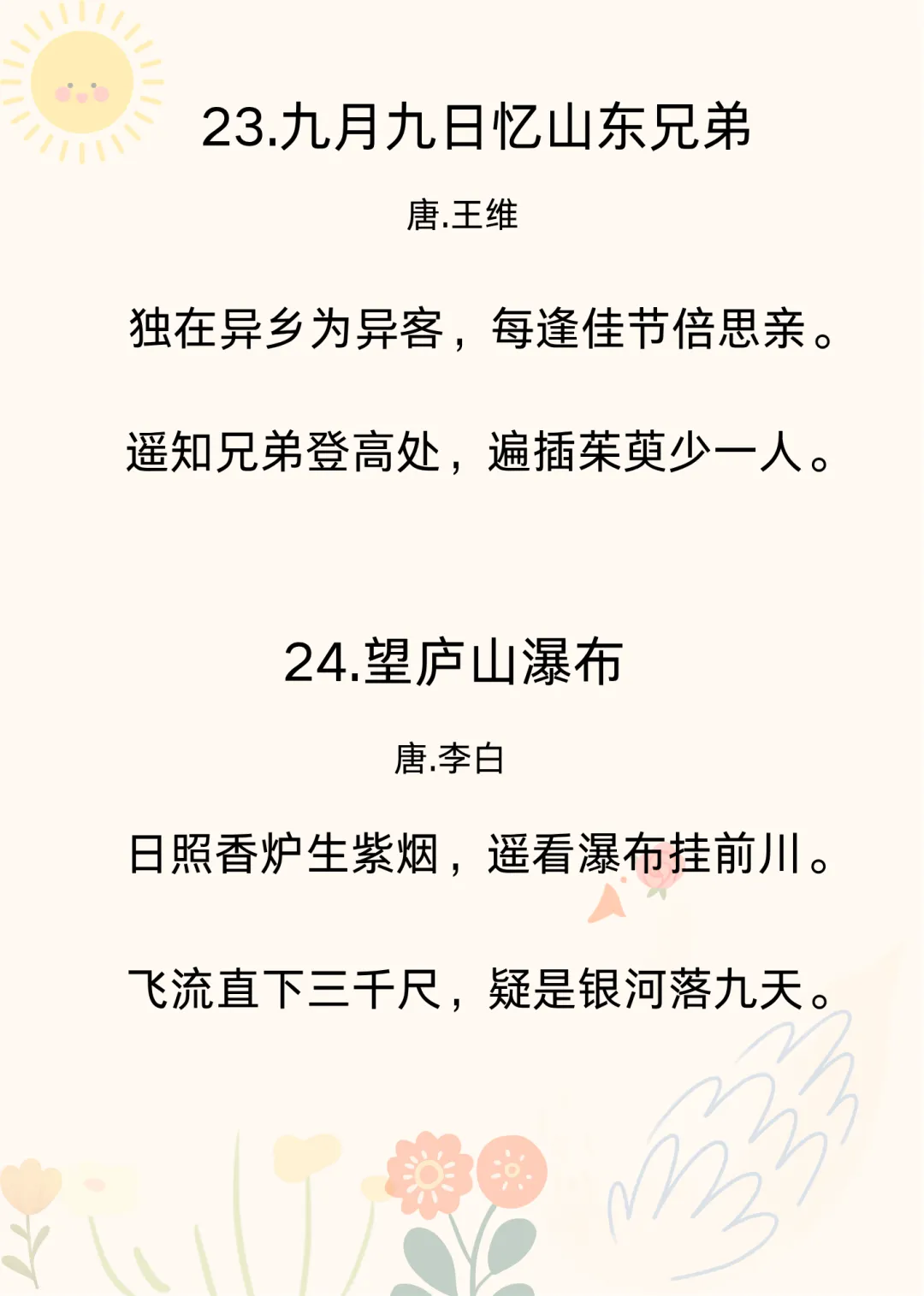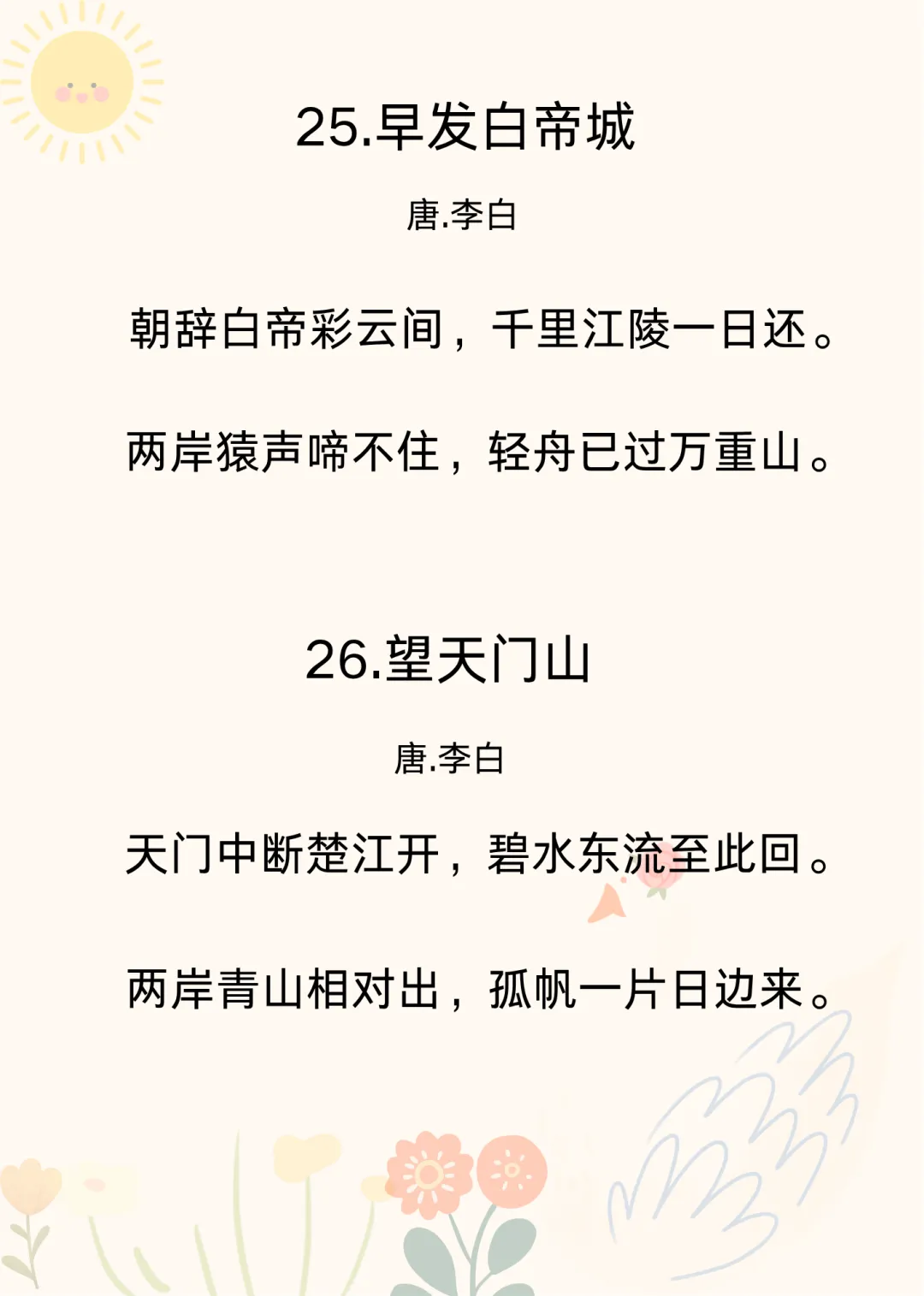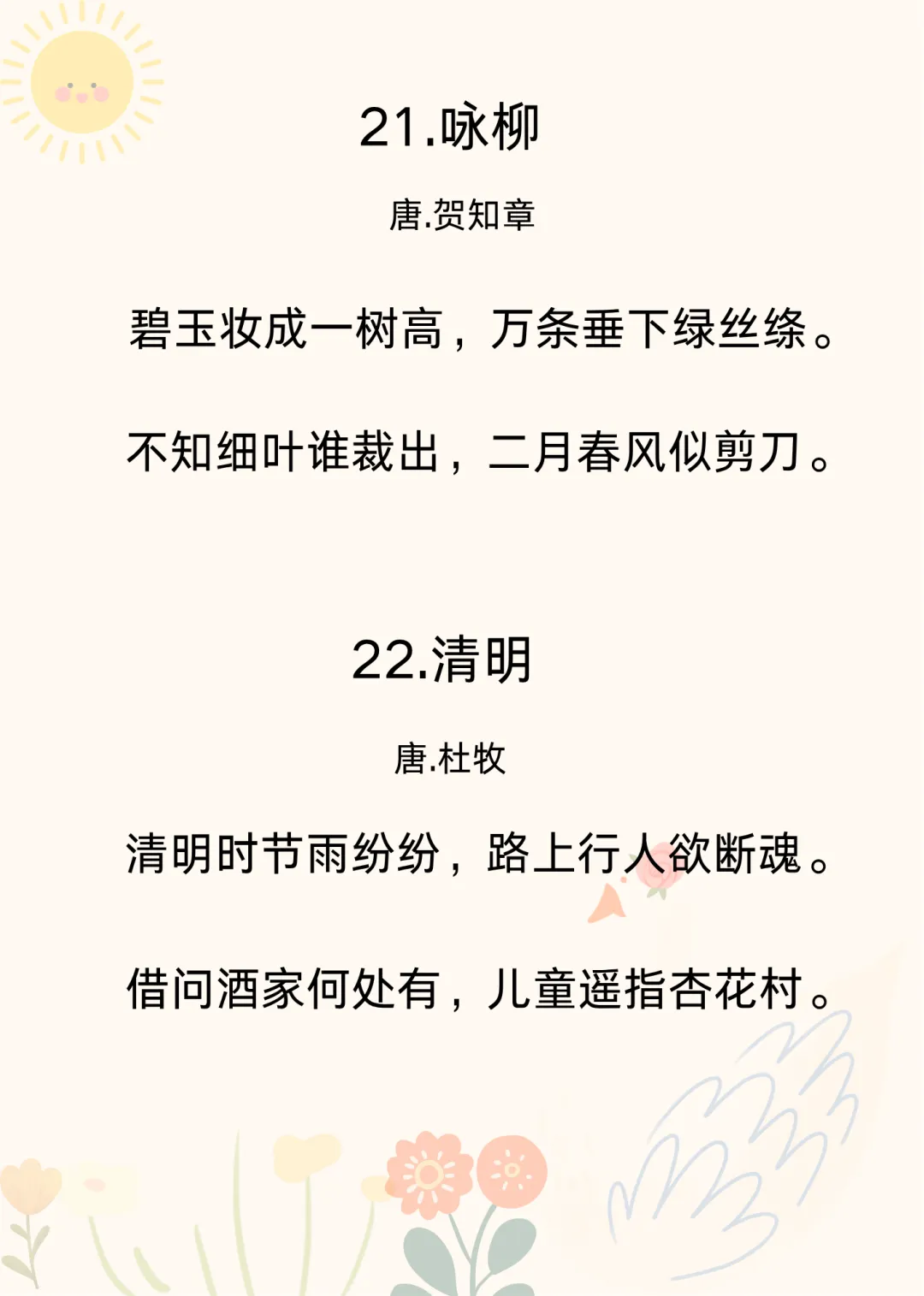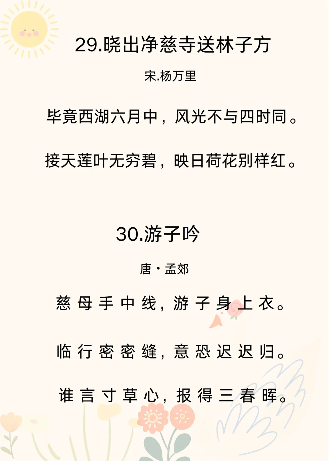 可打印 |幼儿园必背古诗40首(三)想给孩子做古诗启蒙的爸爸妈妈们,来给孩子念古诗磨耳朵啦~之前已经整理过两篇了,我放在了文章末尾。今天整理的这10首古诗,节奏平缓,句子简短,音韵柔和,读起来朗朗上口,轻快又不吵闹,是宝宝的最爱。出门遛弯、哄孩子睡觉的时候给孩子念一念,或者当成儿歌唱给孩子听。教孩子古诗,不要急着有结果,总是问孩子“记住了吗?”“学会几首了?”“给妈妈背一背”,这样孩子会觉得学古诗是一项被安排的任务。咱就只管“熏陶”,剩下的交给时间,也交给孩子自己。只要保持热爱,保持兴趣,就是最好的启蒙。之前有很多家长说想要40首古诗的可打印版,我今天整理出来了。有需要的家长朋友,可以在公众号后台回复【古诗】领取。不着急的家长,也可以等我慢慢更新~💛往期暖心育儿分享👉可打印 | 幼儿园必背古诗10首,抓住孩子黄金早教期👉可打印 |幼儿园必背古诗40首(二)👉幼儿园小朋友要会的拼音“顺口溜”👉幼儿园大班一定要会的20以内加减法顺口溜👉这才是幼儿园该学的“顺口溜”(二)👉这才是幼儿园该学的“顺口溜”