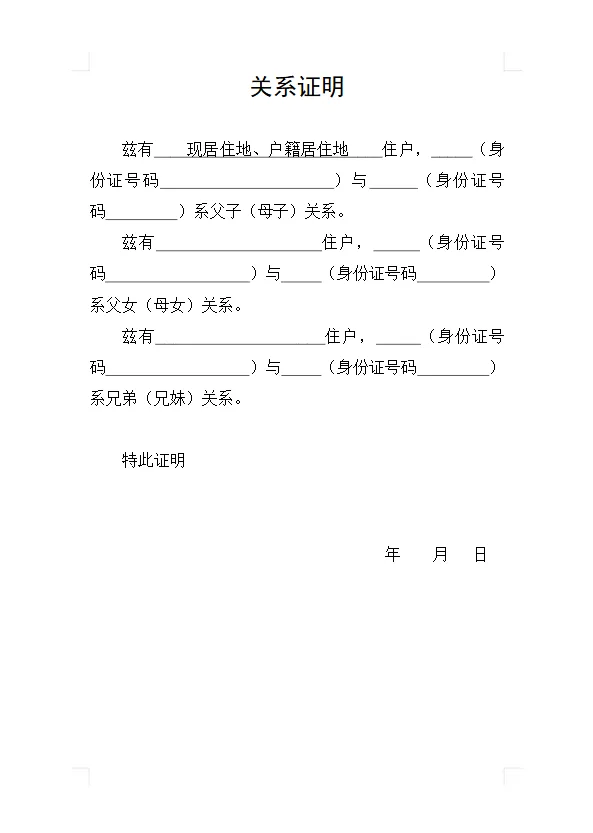 - 标题:居中加粗标注 “XX 关系证明”(如 “亲属关系证明”“劳动关系证明”),二号宋体,清晰醒目;