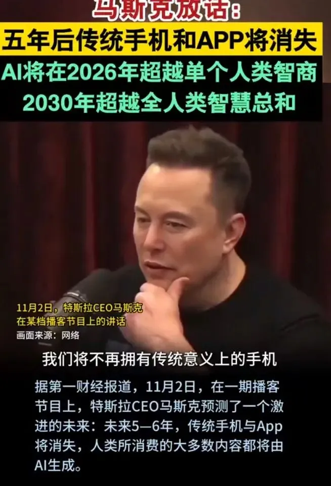 去年底,马斯克在一期播客上给出了一个相当具体的预测:未来5到6年,传统手机和App将彻底消失。在他看来,未来不会有操作系统,不会有App,人们消费的大多数内容都将由AI实时生成。手机不再是一堆图标的载体,而是一个AI推理的边缘节点——负责显示像素和发出声音,服务器端的AI决定你需要看什么,然后实时生成。