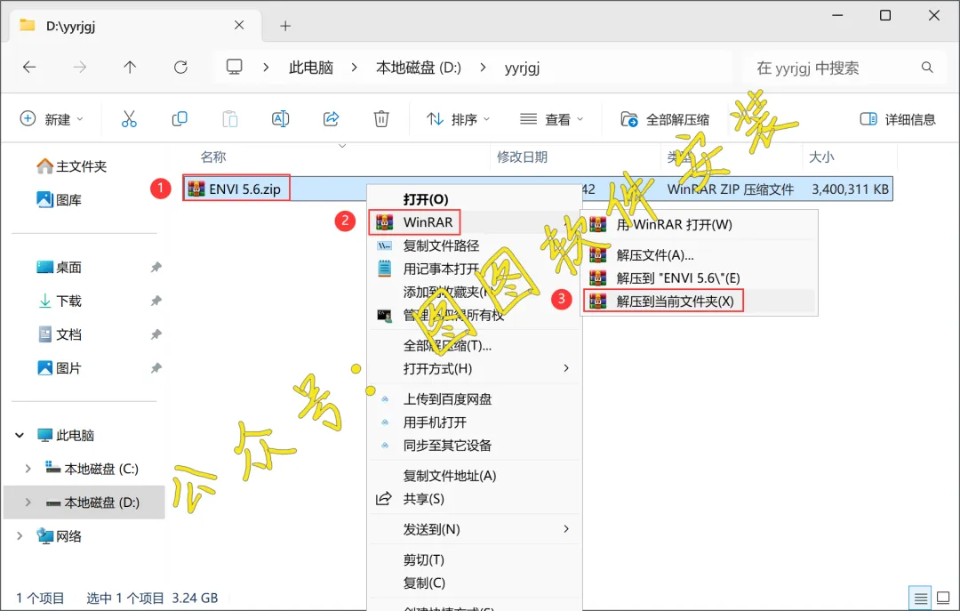 1.将ENVI 5.6软件安装包下载到电脑上,我是下载到D盘的一个英文文件夹内。右键ENVI 5.6软件安装包,点击【解压到当前文件夹】