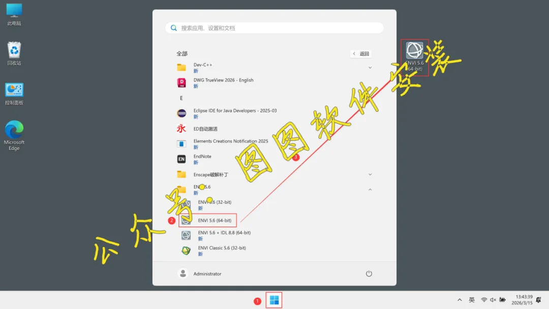14.回到电脑桌面上,点击【Windows徽标】,找到【ENVI 5.6 (64-bit)图标】,并长按鼠标左键将软件图标放置到桌面,完成ENVI 5.6软件快捷方式的创建