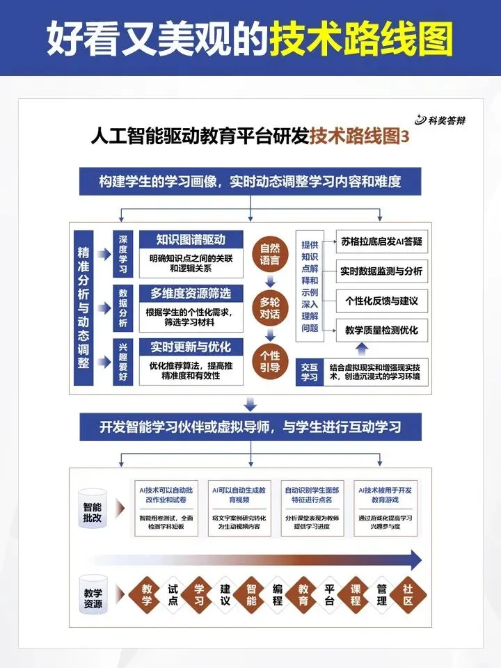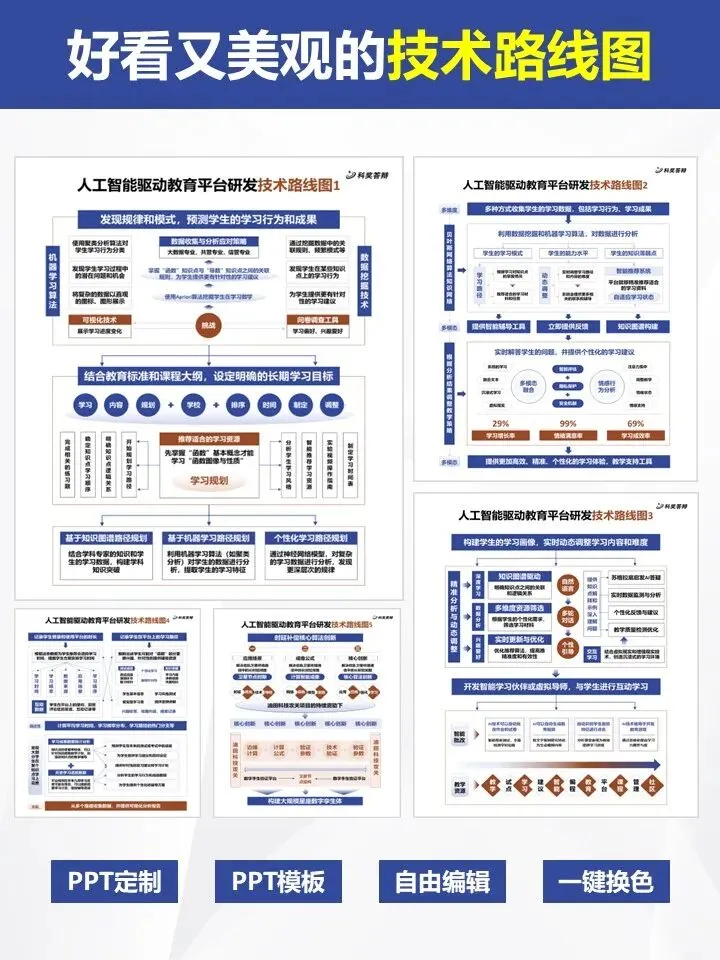 还在为画不出清晰又美观的技术路线图头疼?这组「人工智能教育平台」主题 PPT 模板帮你搞定!涵盖 5 种不同版式,从数据采集、算法设计到应用落地,逻辑链条完整清晰,蓝棕配色专业大气,适配各类科研场景。支持一键换色、自由编辑,轻松替换文字就能直接用,让你的论文和答辩 PPT 瞬间提升质感,省时又省心,科研人必备!PPT制作及科研绘图相关服务,请联系周老师18701118732(微信)