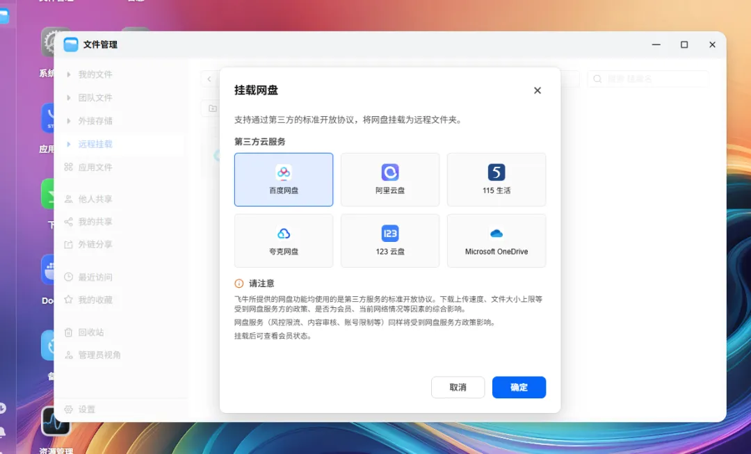 还在为散落各处的网盘文件头疼吗?百度网盘、阿里云盘、夸克网盘、123网盘……资料四处分散,每次编辑都要反复下载上传,效率低到崩溃。现在,飞牛为你打开一扇“任意门”,用远程挂载功能将所有网盘秒变本地硬盘!