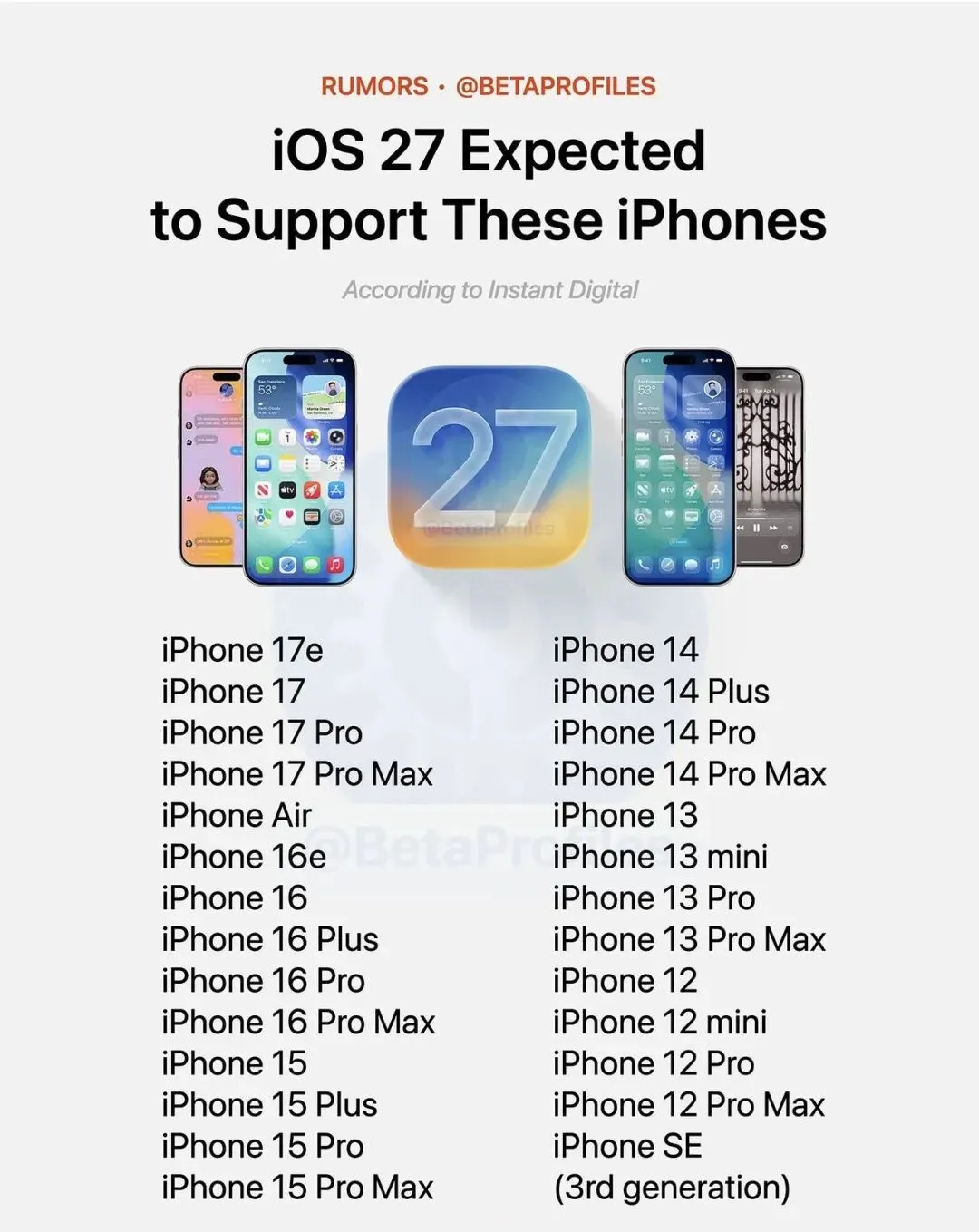按照惯例,iOS 27 将于 6 月 9 日推送首个开发者预览版,7 月开启公开测试,9 月中旬随 iPhone 18 系列和首款折叠屏 iPhone Fold 正式发布。支持机型锁定 iPhone 12 及以上全系,iPhone 11 系列、iPhone SE 2 等四款机型正式被淘汰。不过 iPhone 13 以下机型可能会被限制部分高级 AI 功能。