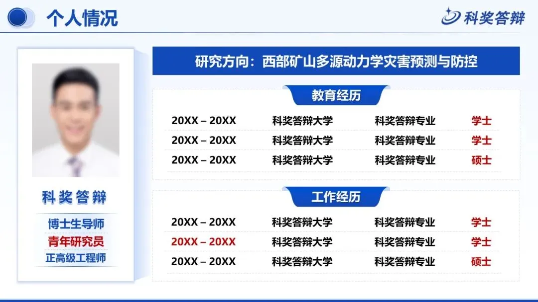 模板完整覆盖个人基本情况、学术成果、研究方案、平台支撑四大答辩核心模块,适配多种研究方向,逻辑清晰、重点突出。