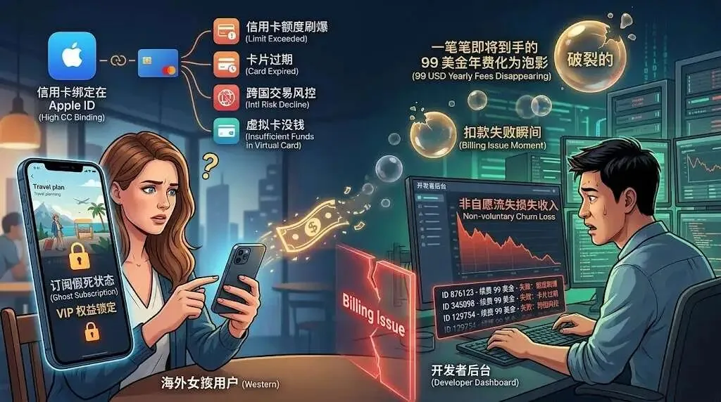 在海外,极高比例的信用卡绑定在 Apple ID 上。由于信用卡额度刷爆、卡片过期、跨国交易风控,或者用户绑定的虚拟卡没钱了,导致苹果在续费扣款的那一瞬间—— 扣款失败了(Billing Issue)。 这种非自愿流失(Involuntary Churn),让你的用户陷入了“订阅假死”状态。用户自己甚至都不知道自己已经不是 VIP 了,而你的后台却眼睁睁看着一笔笔即将到手的 99 美金年费化为泡影。