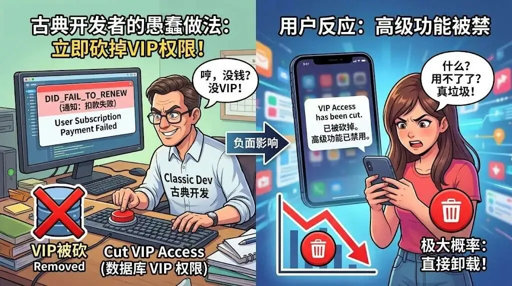 当收到了 DID_FAIL_TO_RENEW(扣款失败)的通知时,古典开发者会直接在数据库里把用户的 VIP 权限给砍掉。这是极其愚蠢的做法!用户一旦发现自己用不了高级功能,大概率会直接卸载。