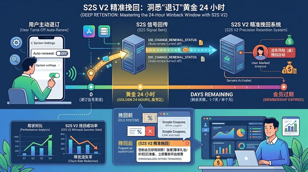 在 2026 年,最顶尖的出海收割机早就抛弃了这种“听天由命”的瞎子模式。他们通过极其硬核的 App Store Server Notifications V2 (S2S V2 苹果服务器端通知),配合底层的宽限期与重试机制,打通了一套极其冷血的“流失大 R 极限挽回漏斗”。今天,我们将深度解剖这项能为你硬生生抢回数百万美金净利润的黑科技!