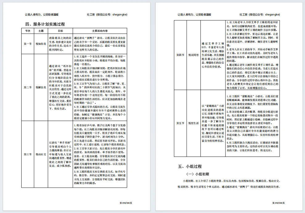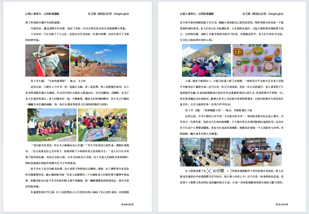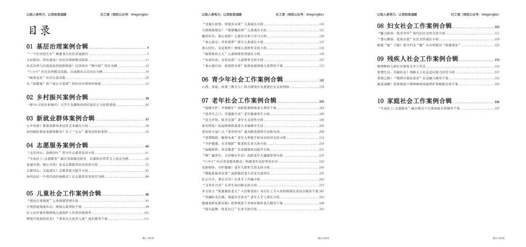 最新发布!社工客2025年精选案例集(PDF版)“社工客”平台始终致力于汇聚中国社会工作的本土实践智慧。每年我们都能收到大量来自一线的案例投稿,它们真实记录了社会治理创新的微观进程与社会工作者陪伴生命成长的温暖足迹。这部《社工客2025年精选案例集》,正是从本平台2025年度所有的原创投稿中精选编纂而成。经过三个多月的精选、排版、校对等工作,现在,案例集终于正式发布。它既是一个专业的实务案例库,也是一个承载着行动与反思的生命故事馆。本案例集严格遵循社会工作专业伦理,其专业性体现在对“助人自助”理念的深入践行,以及对个案、小组、社区等专业方法的系统应用。从精准的需求评估、理论的恰当嵌入,到过程的完整记录、成效的科学评估与深度的专业反思,每个案例都展现了社工在复杂情境下的综合角色与专业素养。我们力求在编辑中平衡真实性与保密性,呈现可信、可学、可鉴的实践样本。翻阅本集,犹如进行一场跨越城乡的治理实践巡礼。从顺德龙山社区的“资产为本”文化营造,到济南“铜小厨”项目探索社区自我造血;从成都文昌社区的“1+3+5”治理模式,到佛山“爱心小菜园”实现的社区治理闭环……这些案例生动诠释了在“五社联动”框架下,社会工作如何激活多元主体,将社区从“管理对象”转化为“治理共同体”,有效培育内生动能。同时,案例集敏锐回应了时代议题与服务群体的拓展。针对“新就业群体”,我们看到了艺术减压与“五心”服务法,体现对其心理健康与职业尊严的深切关怀。在志愿服务领域,从青少年培训到“专业社工+志愿服务”的融合模式研究,揭示了志愿服务专业化、可持续化的路径。儿童友好社区的创建、老年互助体系的构建、残障人士的社会融入、女性力量的激发以及家庭关系的调适等大量案例,则系统展现了面向全人群、全生命周期的精细化服务体系正在形成。这些实践的核心,是将“优势视角”与“增能理论”落到实处,聚焦于发掘人与环境的潜能。我们由衷感谢每一位案例的撰写者。是你们在繁重实务之余,以高度的专业自觉,将宝贵的实践经验凝练为行业共享的知识财富,让那些平凡而伟大的改变被看见、被铭记。我们也感谢所有服务对象与合作伙伴,你们的信任、参与与成长,是所有故事得以书写的根本。我们期望,这本案例集能成为广大同行的实务指南与灵感源泉。当你在设计项目、面对特定群体或提炼模式时,或可从中获得直接的借鉴与方法论的启发。我们也希望这些扎根中国大地的鲜活实践,能为本土社会工作知识体系的构建提供丰沃的土壤。最终,我们愿每一位读者都能从中感受到渗透于字里行间的温度、力量与希望。这温度源于真诚的相遇与陪伴,这力量源于面对困境时的创新与坚守,这希望源于无数行动者正致力于让社区更美好、让人人更有尊严。助人事业,薪火相传。愿这本案例集能陪伴并激励每一位同行者,在共享经验、彼此照亮中,更加笃定地前行,共同推动社会工作在专业化的道路上深耕不辍,让“助人者有力,让受助者温暖”的理想,照进更为广阔的现实。《社工客2025年精选案例集》为社会工作者们提供了丰富的实践智慧和操作指南。本案例集精选收录了2025年在社工客平台投稿的53篇原创优秀案例,适合各领域的社会工作者在工作中随时查阅,案例集所提供的案例情境、介入模式及专业反思具有较高的参考、学习及研究的价值。一定程度上,可促进社会工作者提高服务效率和质量。本案例集经过【社工客】编委会严格筛选,以10个社会工作领域作为分类,编审工作历时数月,精心整理、编辑与校对,较大程度上确保了内容的实用性和专业性。
