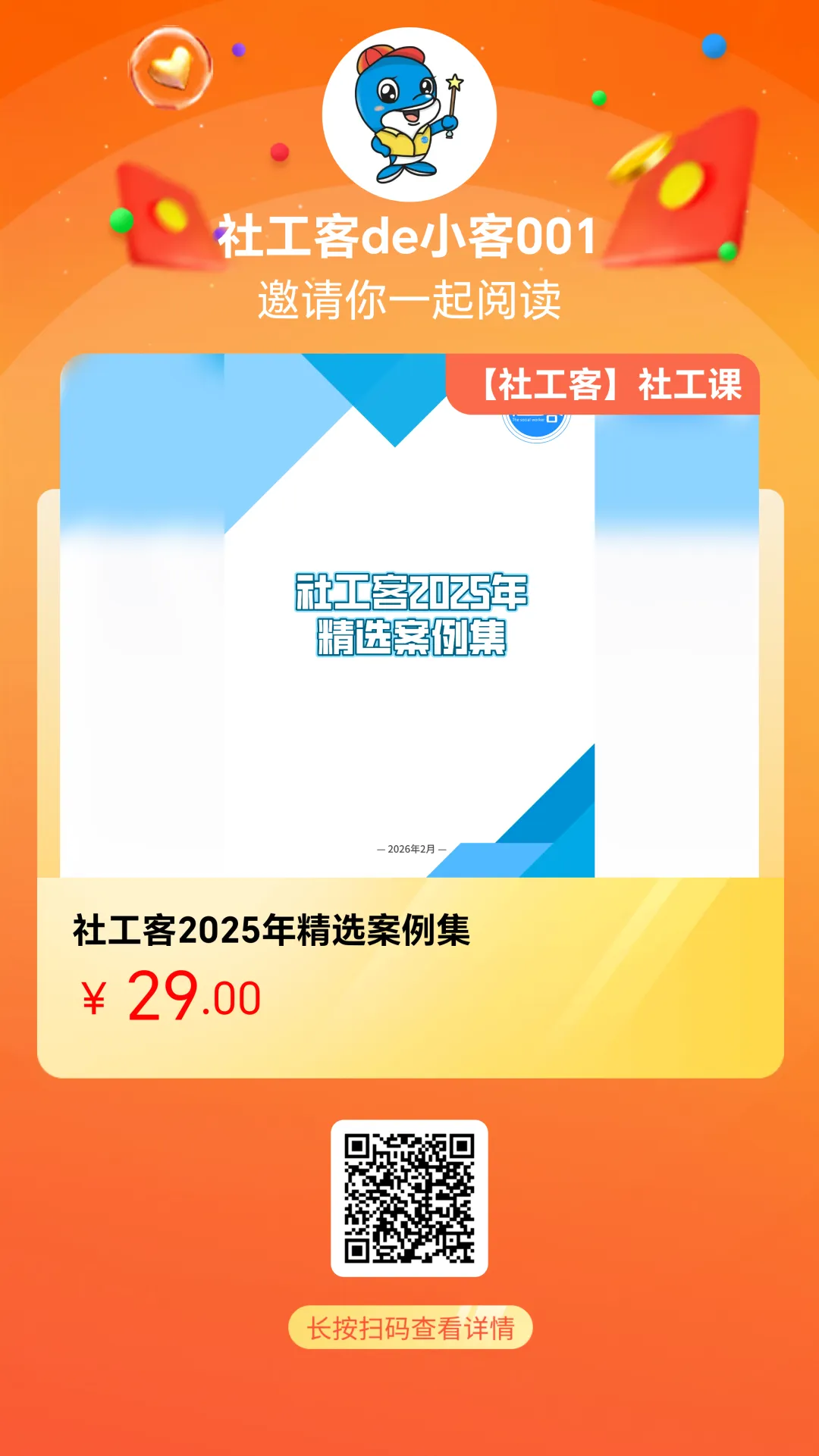 2.《社工客2025年精选案例集》为电子版资料,订阅后即可以电子书模式阅读,也可点击“相关资料”下载PDF版本,自行下载,收藏阅读。本产品为线上电子产品,订阅成功后不支持退订、转让、退款,请您确认需求后再进行购买。3.本案例集的收益将用于支付平台“原创作者计划”的稿费及平台编辑相关运营成本等。我们希望通过这种方式,让作者得到激励,也促进案例集的可持续性,为社会工作行业的知识传播和专业提升贡献一份力量。同时,我们欢迎各大公益基金会及相关单位资助此项计划。社工客(The social worker),一个致力社会工作者成长与互动的社群。【社工客】立足深圳,面向全国,由深圳资深社工发起,我们以“连接产生美好”为理念,致力“社会工作者及慈善公益人士”社群营造的同时,着力青年公益人才的培养及社会参与,为青年公益人才搭建社会参与互动平台。现有的【社工客】自媒体品牌全网用户累计达90万,内容阅读量累计达1.5亿,是中国社会工作者联合会、中国社会出版社等单位特邀合作伙伴,多次位居“新榜”微信公众号排行榜公益慈善领域首位,已逐渐成为我国具有一定影响力的公益社群IP。价值观(Values):连接、分享、陪伴。我们相信连接产生美好;我们相信分享创造价值;我们相信陪伴传递能量使 命(Mission):创造能量流动场域,陪伴千万社会工作者成长愿 景(Vision):成就生命价值,共创美好社会声明:本文仅代表作者观点,不代表社工客平台立场。