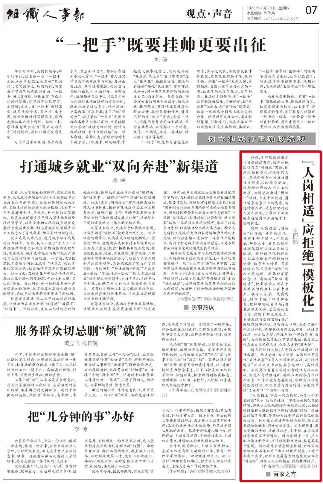 当前,干部选拔任用工作日趋规范有序,但部分地区仍存在“模板化”思维,过度依赖标准化指标评判人才,忽视干部个体特质与岗位实际需求的精准契合。践行新时代选人用人工作要求,必须坚决打破“模板化”桎梏,立足干部特质、岗位需求与事业长远发展,构建精准匹配、动态优化的选人用人机制,让每位干部都能在适宜岗位上施展才干、实现价值。