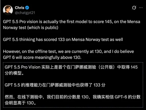 2. 基准测试与应用数据在测试环境中,GPT-5.5 录得以下数据:Terminal-Bench 2.0 (82.7%)、SWE-Bench Pro (58.6%)、Expert-SWE (73.1%)、GDPval (84.9%)、OSWorld-Verified (78.7%)、Tau2-bench Telecom (98.0%)、GeneBench (25.0%)、BixBench (80.5%)、GPQA Diamond (93.6%)。第三方平台公布的门萨挪威测试记录中,GPT-5.5 Pro 视觉模式识别得分记录为 145,推理得分记录为 133。