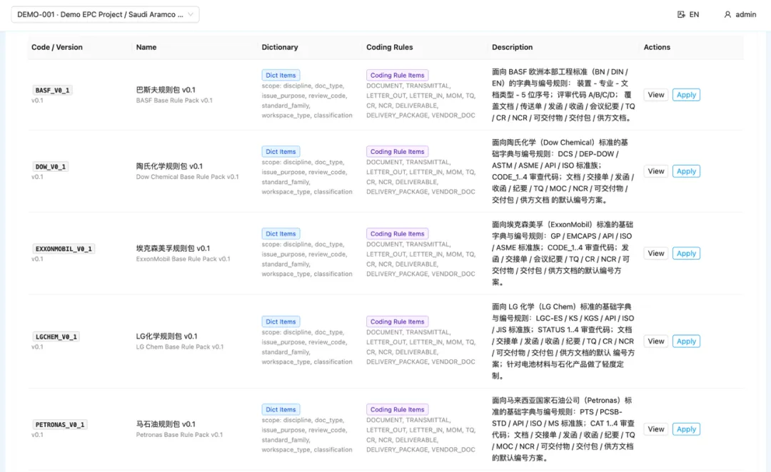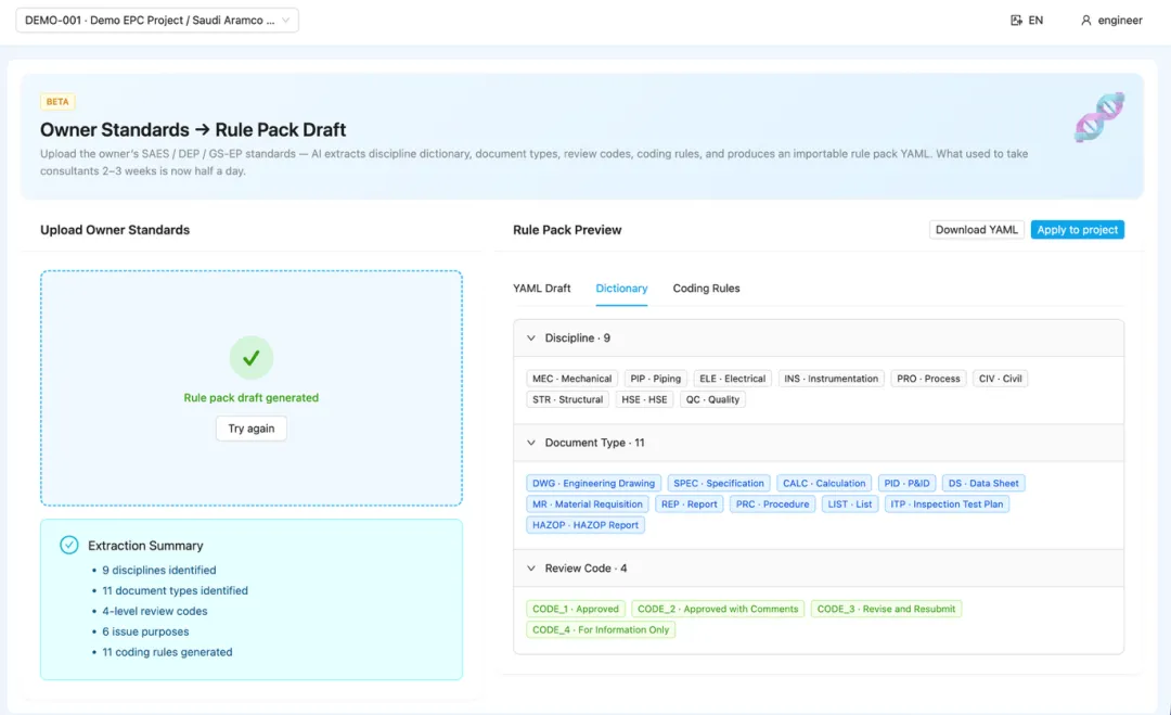 新项目启动阶段,文控主管上传业主发来的 SAES/DEP/GS-EP 等技术规格书 PDF,AI 自动抽取编号规则、字典术语、审查码,生成可直接导入的规则包 YAML 草稿,现场工程师当天即可跑通文档编号——传统咨询公司做这件事要 2~3 周。