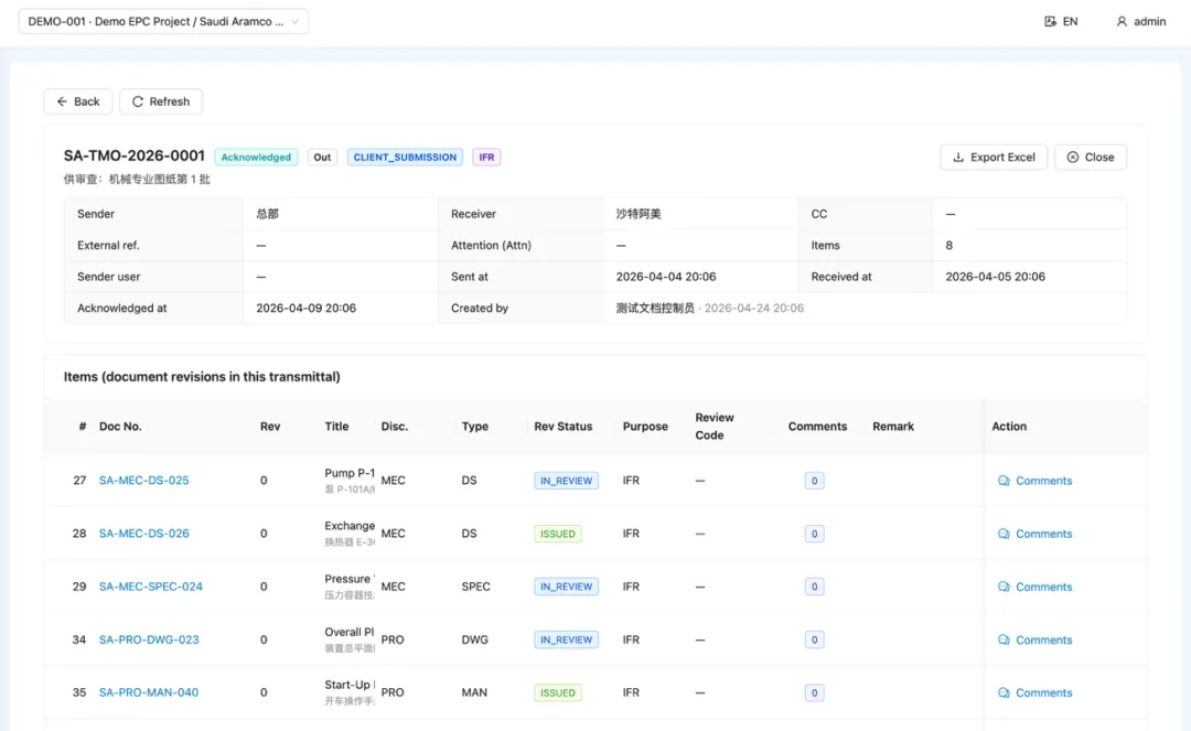 国际 EPC 项目每次送审都必须走传送单(Transmittal),业主返回后的意见必须拆条录入 CRS(Comment Resolution Sheet)并逐条追溯关闭:
