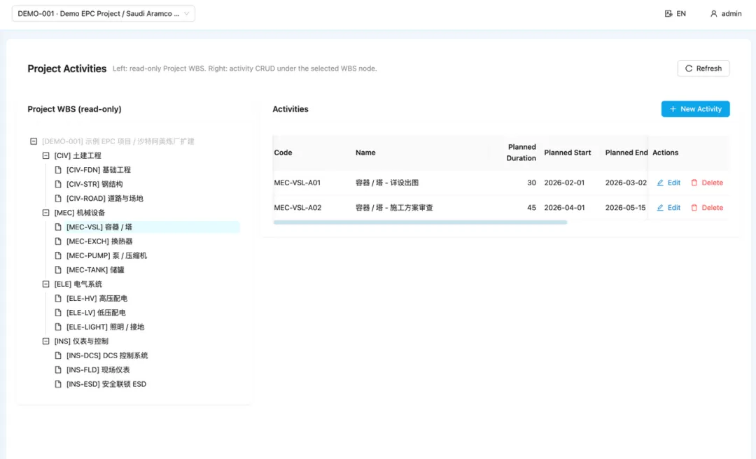 多根 WBS 树支持(如土建/机械/电气/仪表/工艺各自一棵)