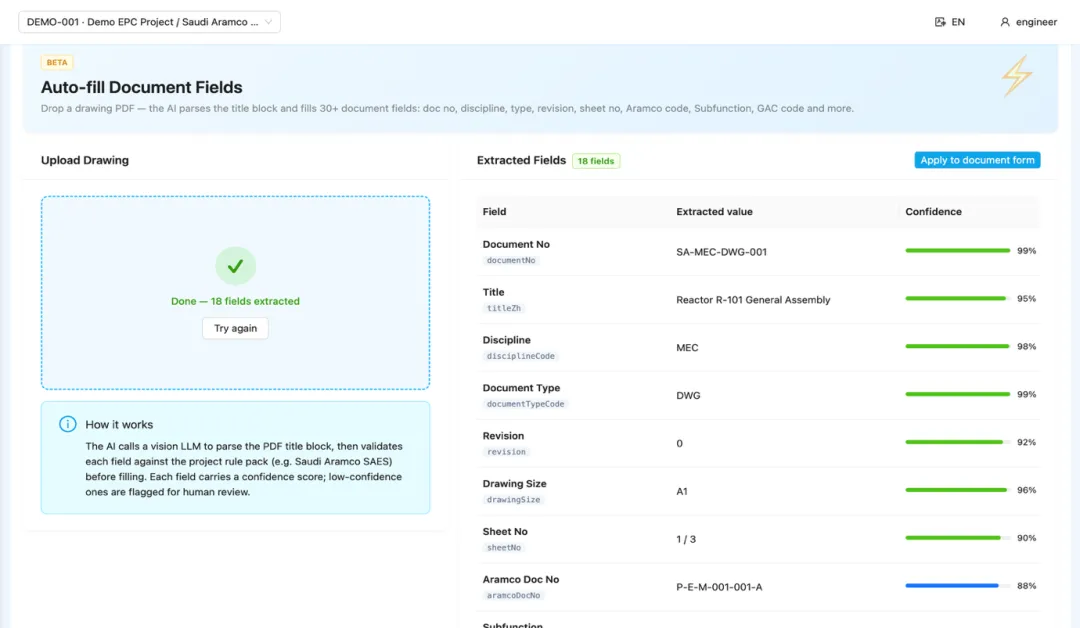 工程师拖拽一份 PDF 进来,AI 扫描 title block,自动填充文档编号、专业、类型、版本、图号、图幅、业主编码、Subfunction、GAC Code、Phase Code 等 30+ 字段。文控员只需核对,不再需要手工录入。