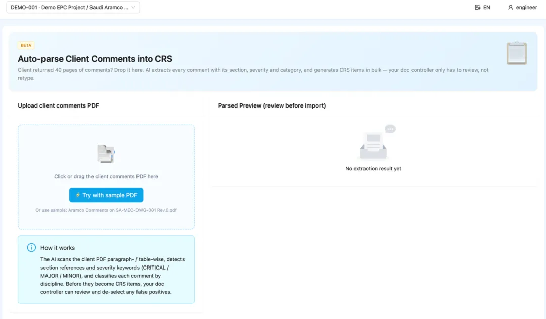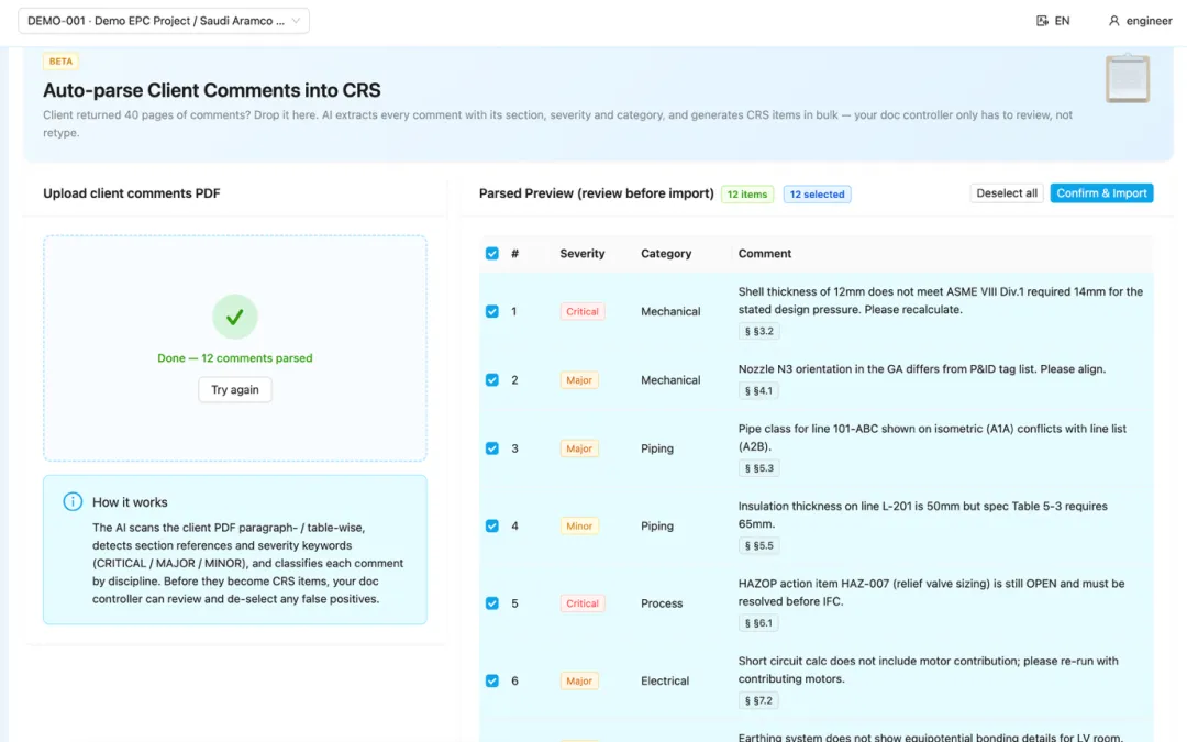 业主发来 40 页的"Comments on Rev 0"PDF,AI 一键解析成 30~80 条结构化 CRS 条目(章节号、严重度、正文、是否可关闭),预览确认后批量入库。文控员从 2 小时手录降为 5 分钟复核。