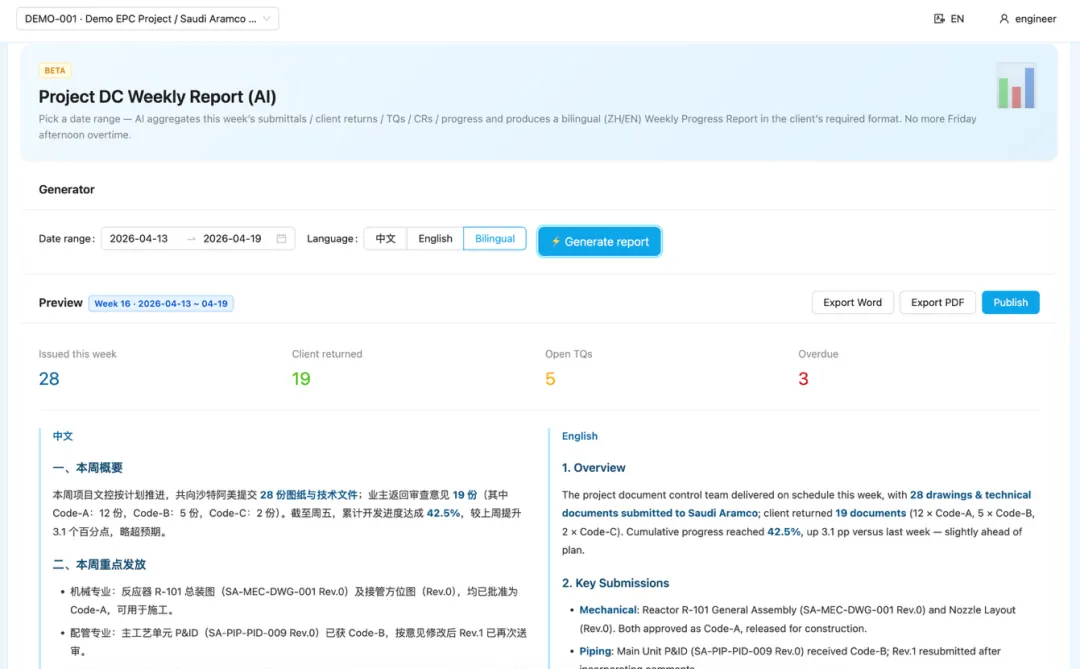 扫当周送审事件/审批任务/评论/业主返回 的数据,AI 按模板生成中英文双语文控周报,直接对接业主要求的 Weekly Progress Report 格式。