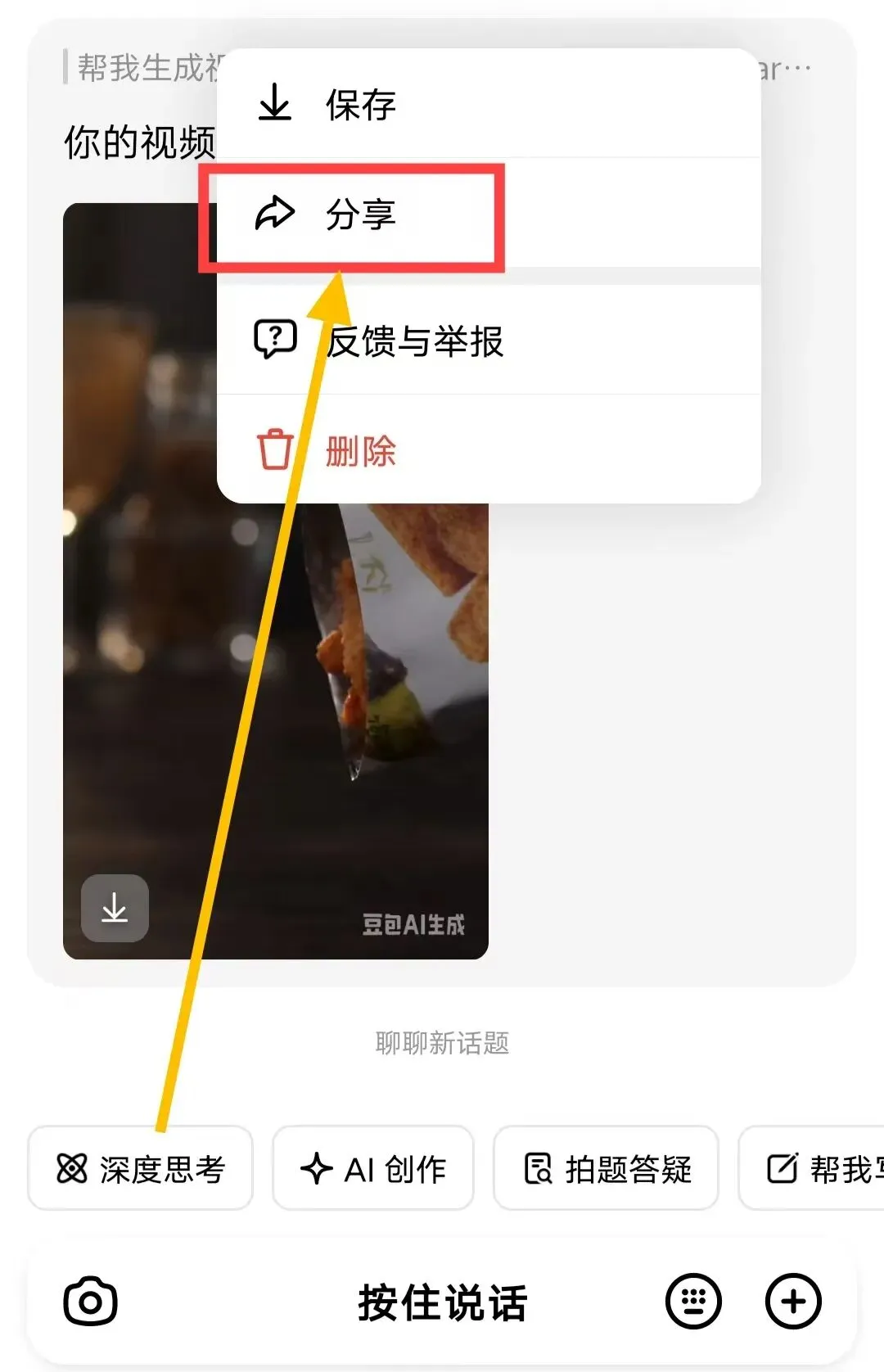 咱们以视频为例,第一步要在手机端操作,长按生成好的视频点击分享