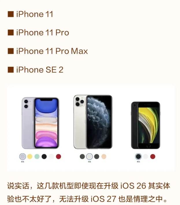 爆料这边同时飞,名字也不陌生,彭博社的马克·古尔曼点了题,国内“刹那数码”跟着补刀,门槛再抬一格,A13 芯片那几款要停在站台了,名单里有,iPhone 11,iPhone 11 Pro,iPhone 11 Pro Max,iPhone SE 第二代,停更的意思很直白,留在 iOS 26,不去 27,Siri 的 AI 重构摸不到,界面那层“液态玻璃”特效也看不见。