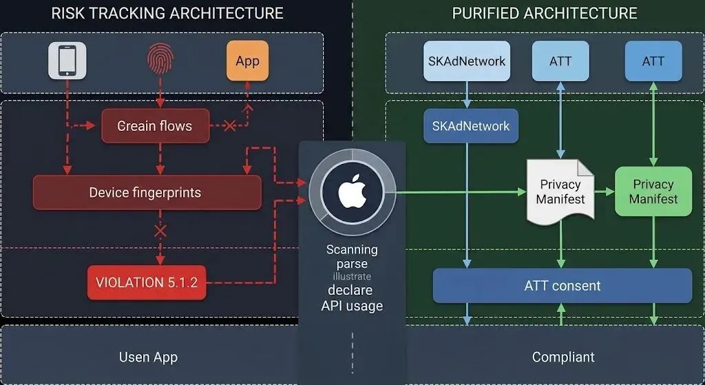 然而,进入 2026 年,Apple 针对设备指纹发起了史无前例的“隐私核弹级清算”。《App Store 审核指南》5.1.2 条款被极其严格地执行:严禁应用通过收集设备和使用数据来创建用户标识符(指纹识别)。 苹果的安全探针现已全面具备了对系统底层 API 静默调用的深度嗅探能力,一旦发现您的应用在绕过 ATT 政策进行隐蔽追踪,不仅当前提审包体直接红牌秒杀,整个开发者账号及名下所有矩阵将因“严重侵犯用户隐私与规避操作系统限制”遭遇跨国连坐封杀。本文深度解析苹果防指纹追踪的核查机制及纯净化提审架构。