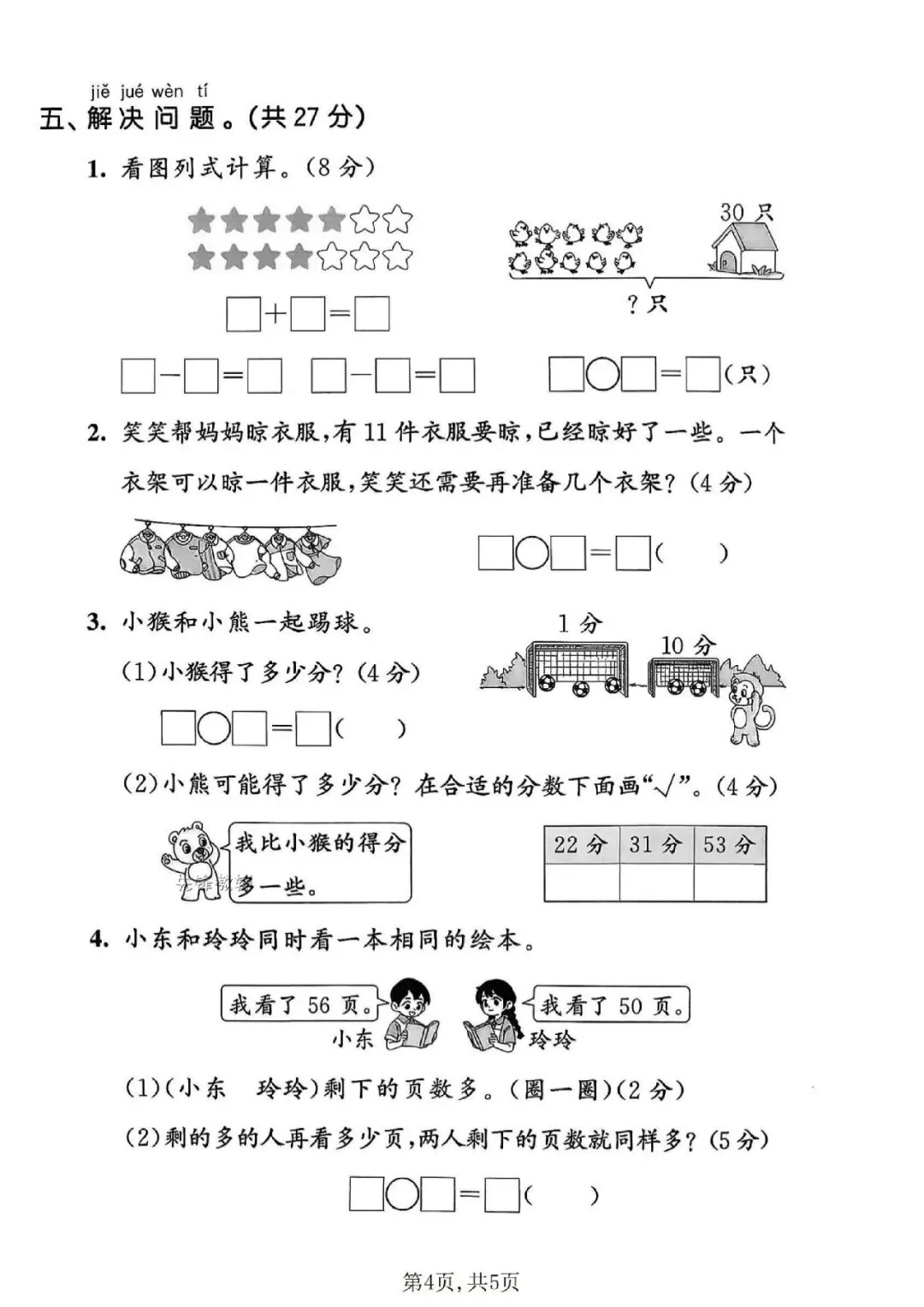 一年级下册数学期中测试卷可打印, 人教版考试试卷大家好,这里是淘学学资料库,这份《一年级下册数学期中质量检测卷《人教版》》,完整 pdf 电子档共 5 页。这份试卷为人教版一年级下册数学期中测试卷,涵盖填空、选择、计算、操作、解决问题五大题型,考查数的组成、找规律、百数表、20 以内进退位加减、图形认知、实际应用题等期中核心考点,题目贴合教材,难度适中,全面检测知识掌握情况。这份检测卷题型规范、考点全面,包含基础计算与思维拓展题,配有完整答案,既能用来进行期中模拟测试,也可用于日常复习查漏补缺,帮助孩子熟悉考试题型、提升答题速度与正确率,扎实巩固前半学期所学数学内容,轻松应对期中考试。(公众号底部菜单查看完整pdf获取方式)