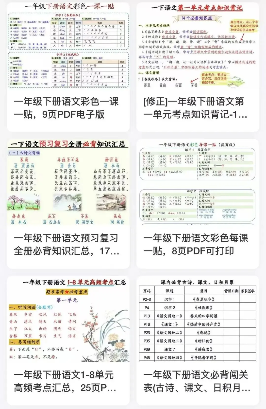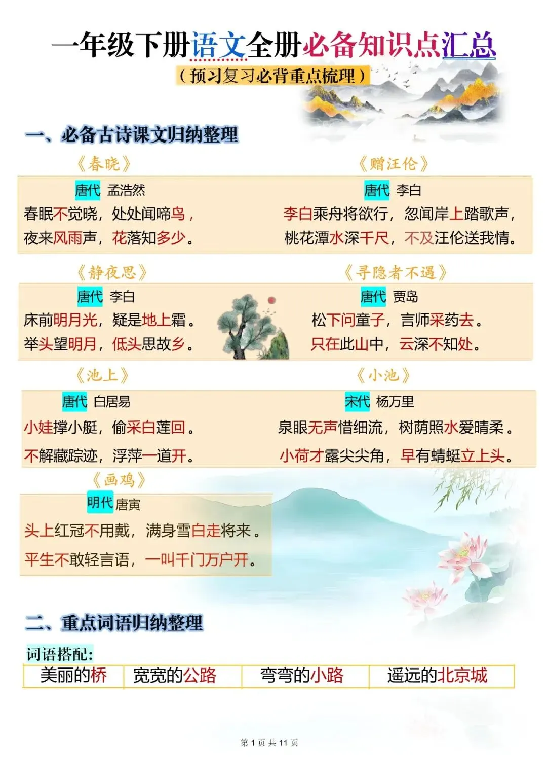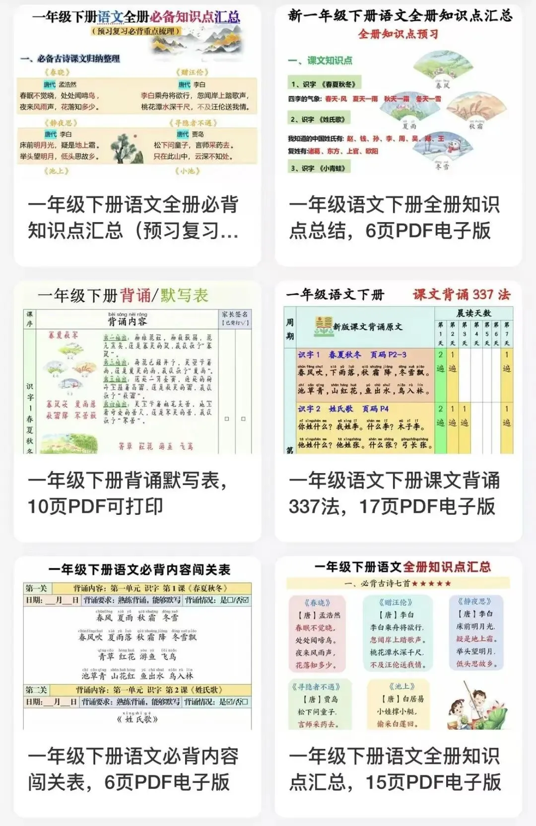 大家好,这里是淘学学资料库,这份《一年级下册语文全册必背知识点汇总》,完整 pdf 电子档共10页。这份资料汇总全册必背古诗、重点词语、句式、名言谚语、课文核心考点,把字词、句式、常识、课文中心思想整理清晰,覆盖考试常背内容,方便孩子快速记忆、预习复习。这份知识点汇总按单元分类、重点突出,好背好记,包含 ABB、AABB、反义词、成语、气象谚语、歇后语等高频考点,还有每篇课文的中心思想与重点内容,全面覆盖期中期末考点,既能帮孩子夯实语文基础,又能高效背诵、快速提分,是预习、复习、考前冲刺的必备资料。