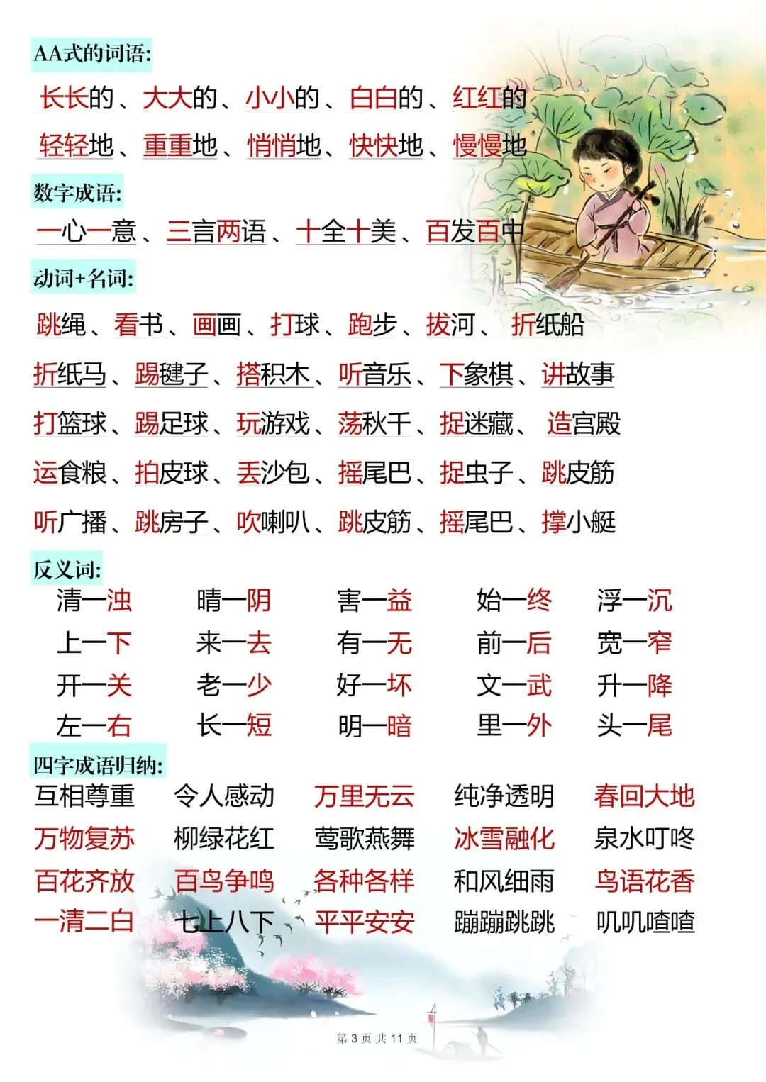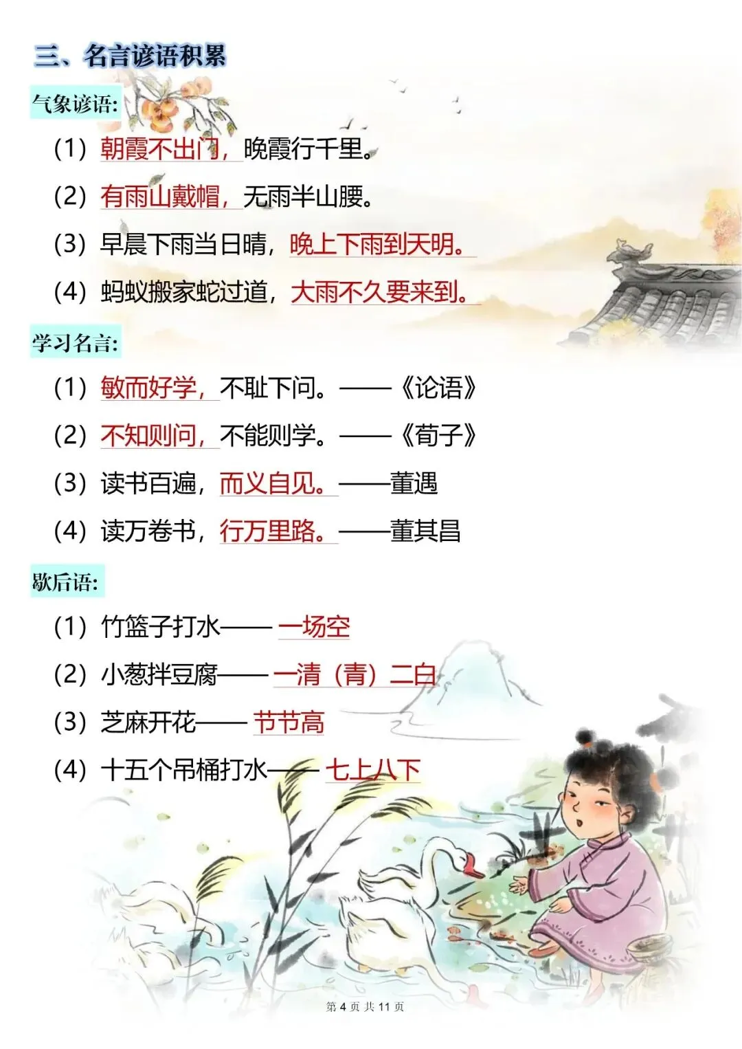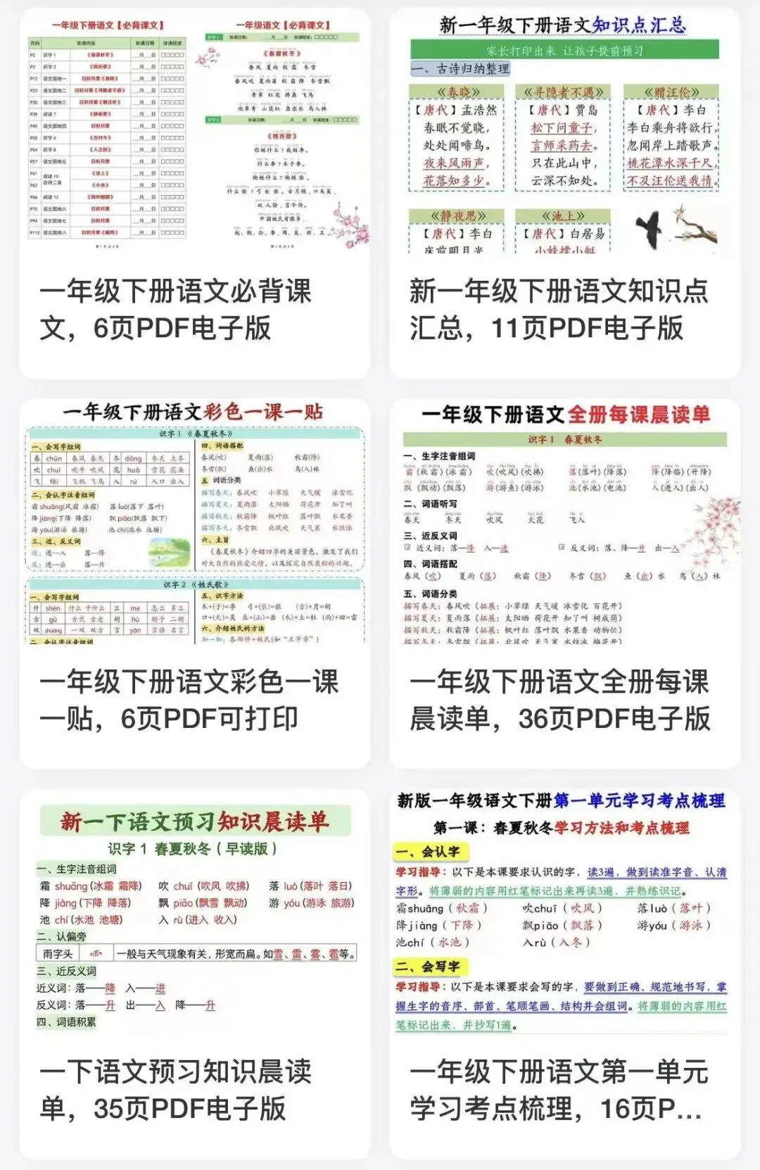 大家好,这里是淘学学资料库,这份《一年级下册语文全册必背知识点汇总》,完整 pdf 电子档共10页。这份资料汇总全册必背古诗、重点词语、句式、名言谚语、课文核心考点,把字词、句式、常识、课文中心思想整理清晰,覆盖考试常背内容,方便孩子快速记忆、预习复习。这份知识点汇总按单元分类、重点突出,好背好记,包含 ABB、AABB、反义词、成语、气象谚语、歇后语等高频考点,还有每篇课文的中心思想与重点内容,全面覆盖期中期末考点,既能帮孩子夯实语文基础,又能高效背诵、快速提分,是预习、复习、考前冲刺的必备资料。