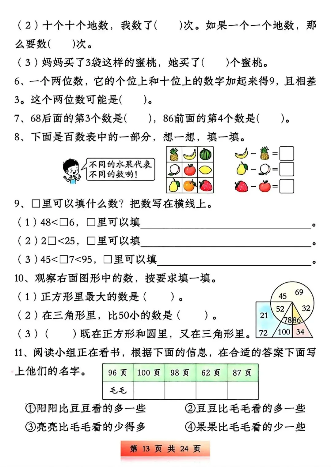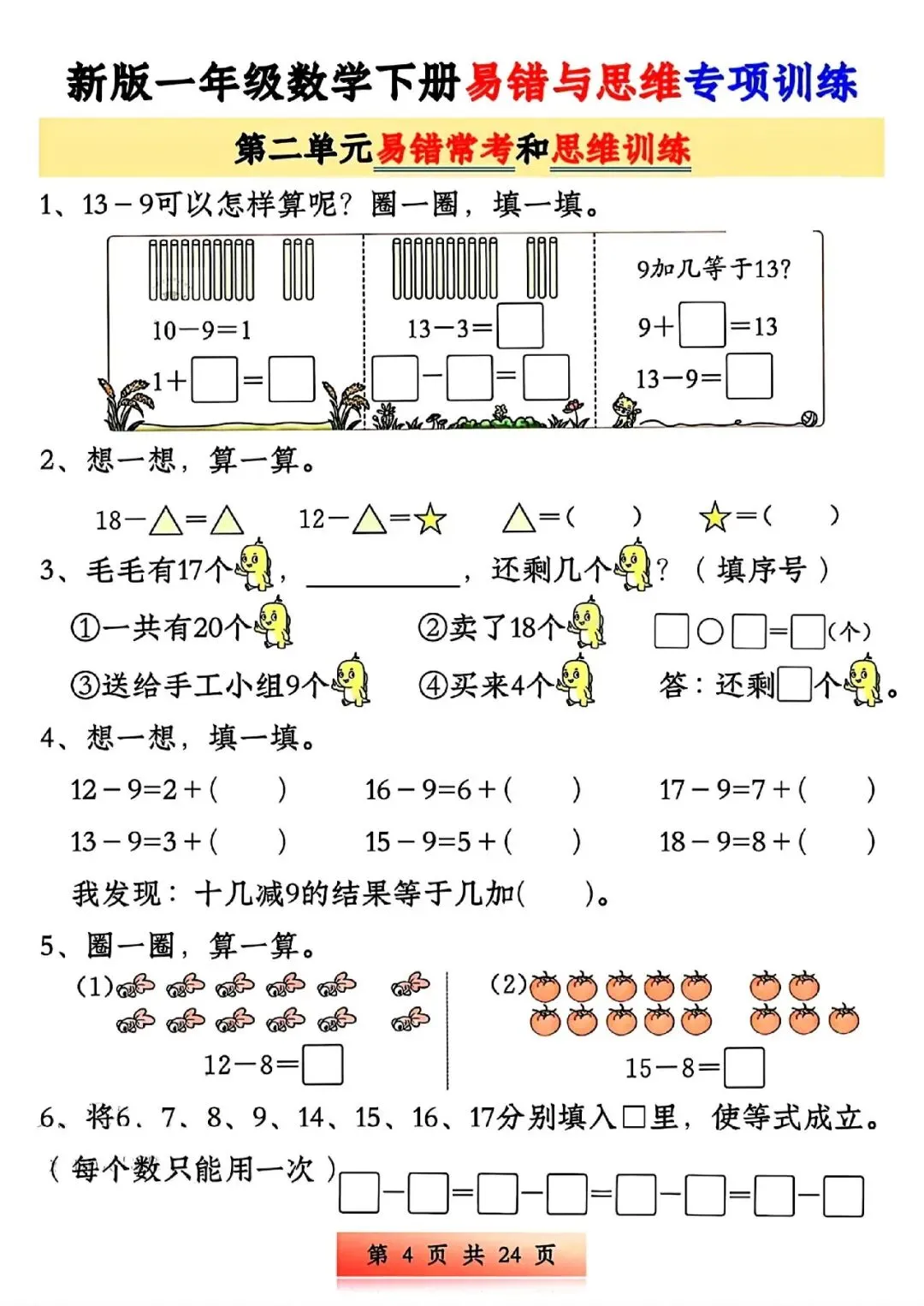 一年级下册数学思维题专项训练,每日一练可打印大家好,这里是淘学学资料库,这份《一年级数学下册易错与思维专项训练》,完整 pdf 电子档共 24 页。这份资料按单元整理易错点和思维拓展题,涵盖图形认知、20 以内退位减法、100 以内数的认识、加减法计算等核心内容,包含填空、选择、计算、解决问题等题型,直击孩子常错、易混知识点。这份专项训练针对性强,题目贴合课本与考试,既有基础巩固练习,也有思维提升训练,配有典型例题和解题思路,能帮助孩子查漏补缺、强化计算能力与逻辑思维,有效改善粗心、理解不清等问题,适合日常练习、单元复习和考前专项突破,全面夯实数学基础。(公众号底部菜单查看完整pdf获取方式)01截图预览(因篇幅有限,仅展示部分内容)02文件目录一年级数学下册易错与思维专项训练.PDF (24页)03获取方式公众号底部菜单查看完整pdf获取方式END