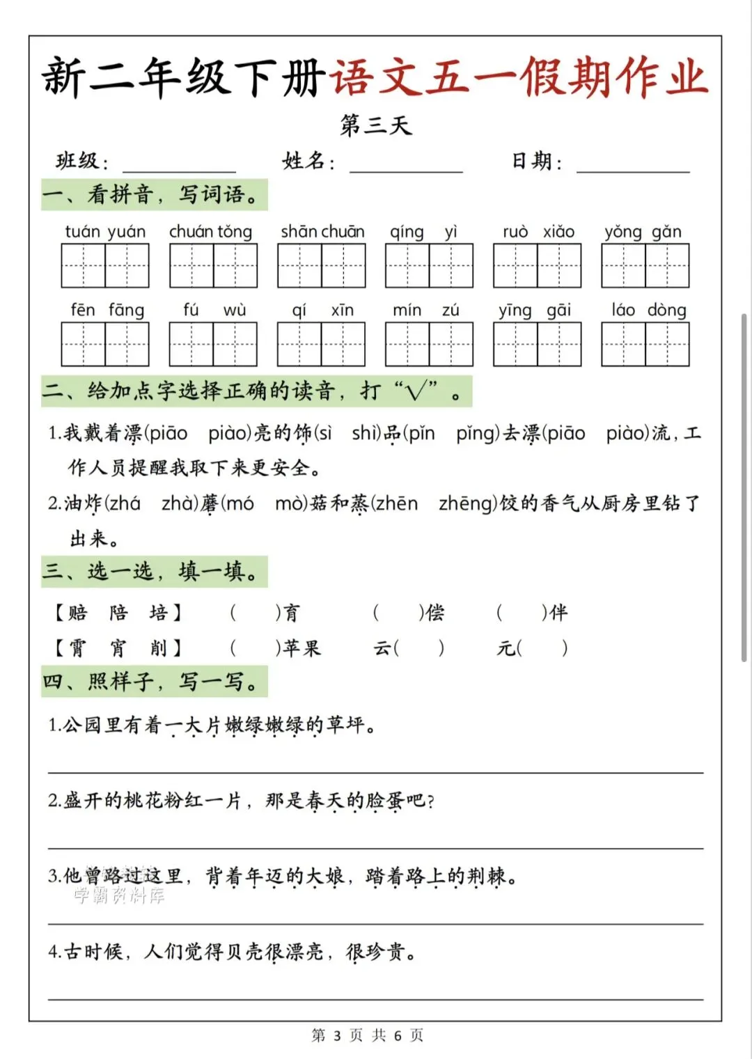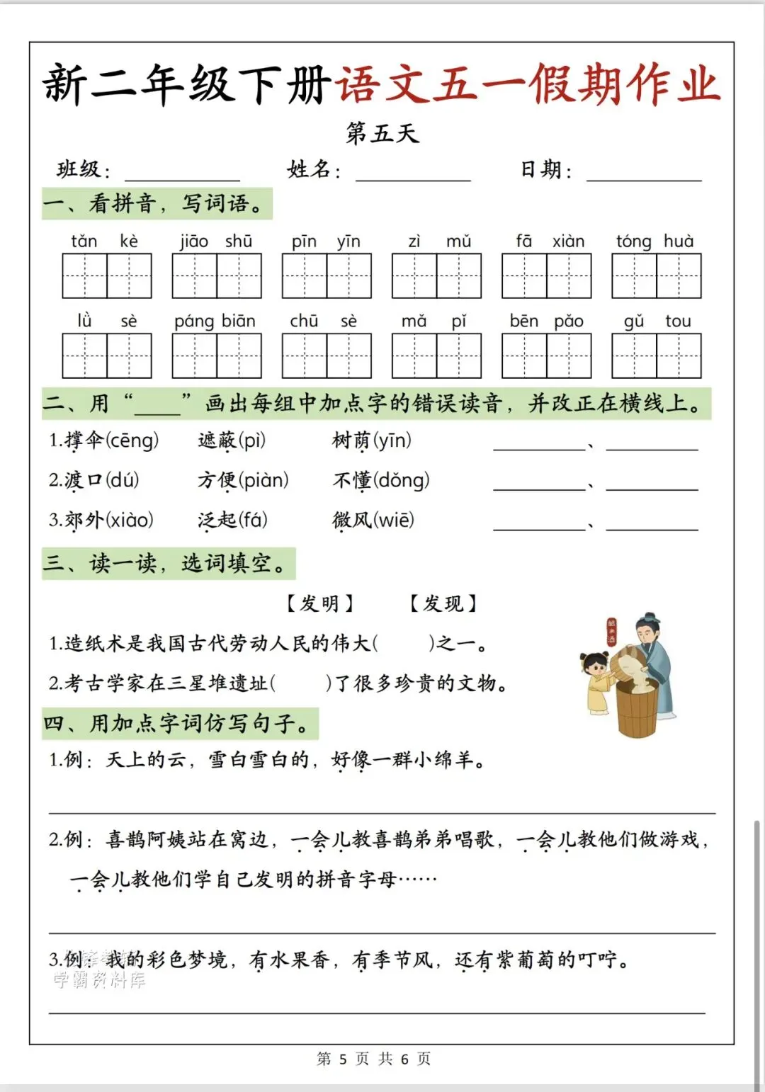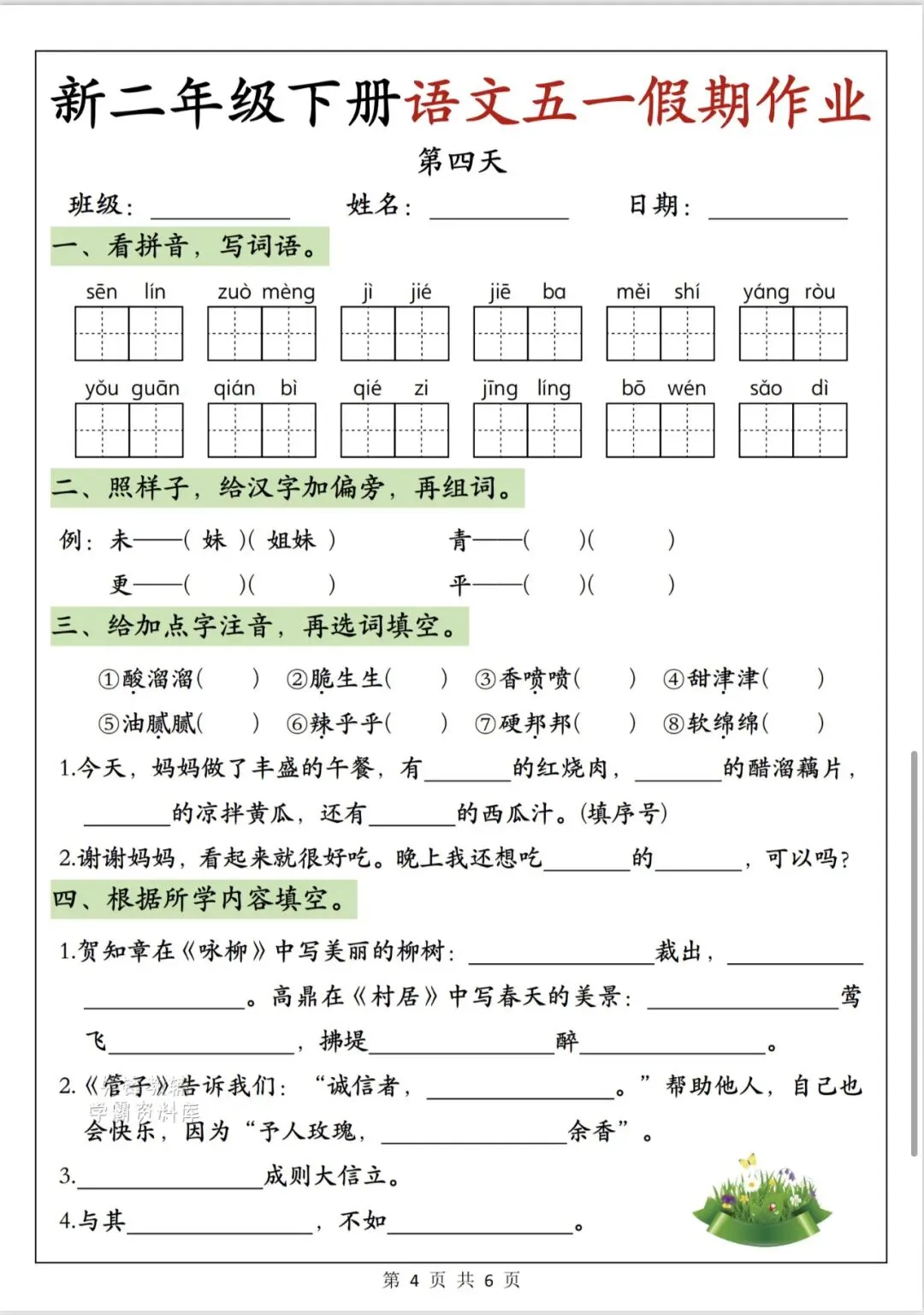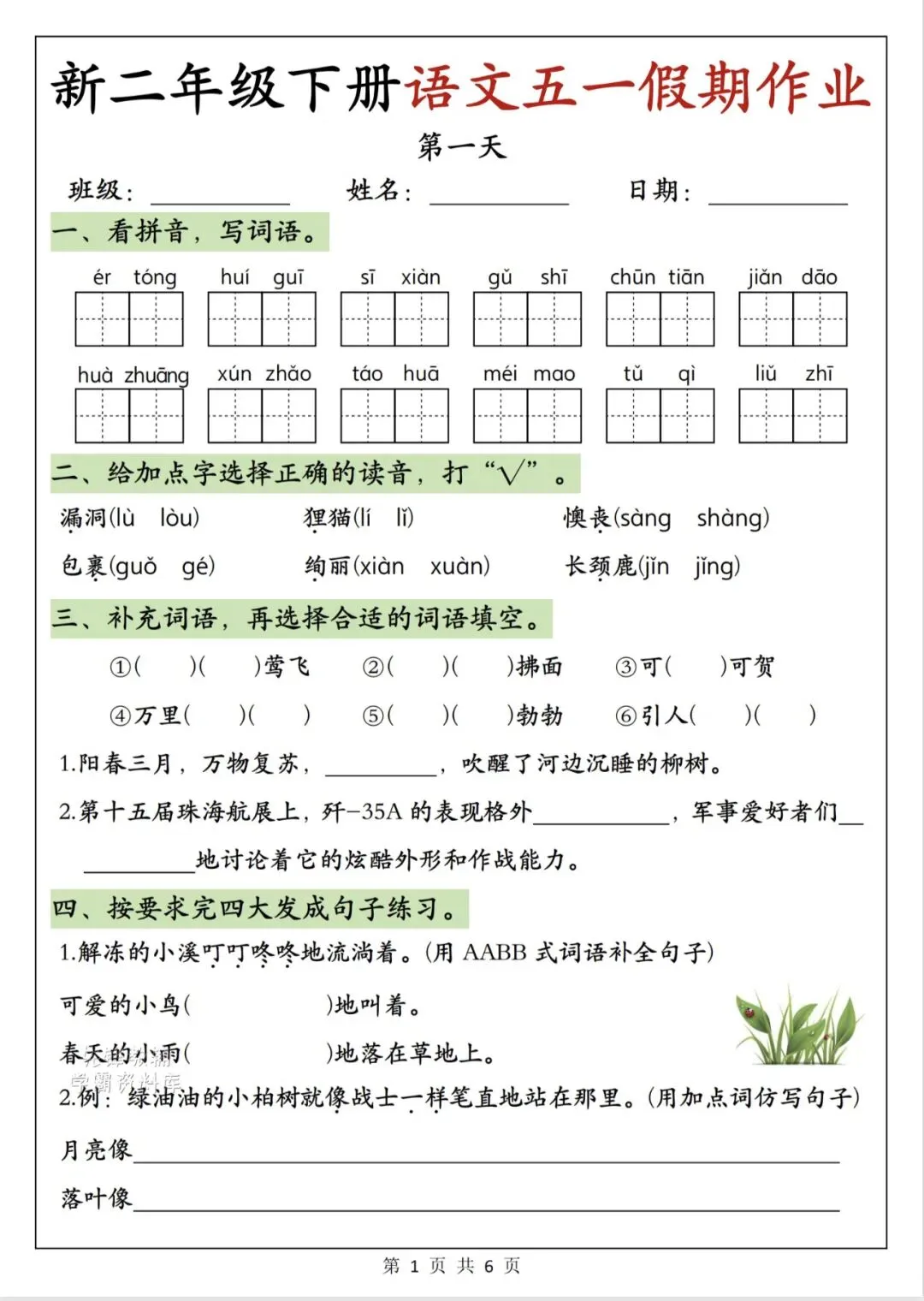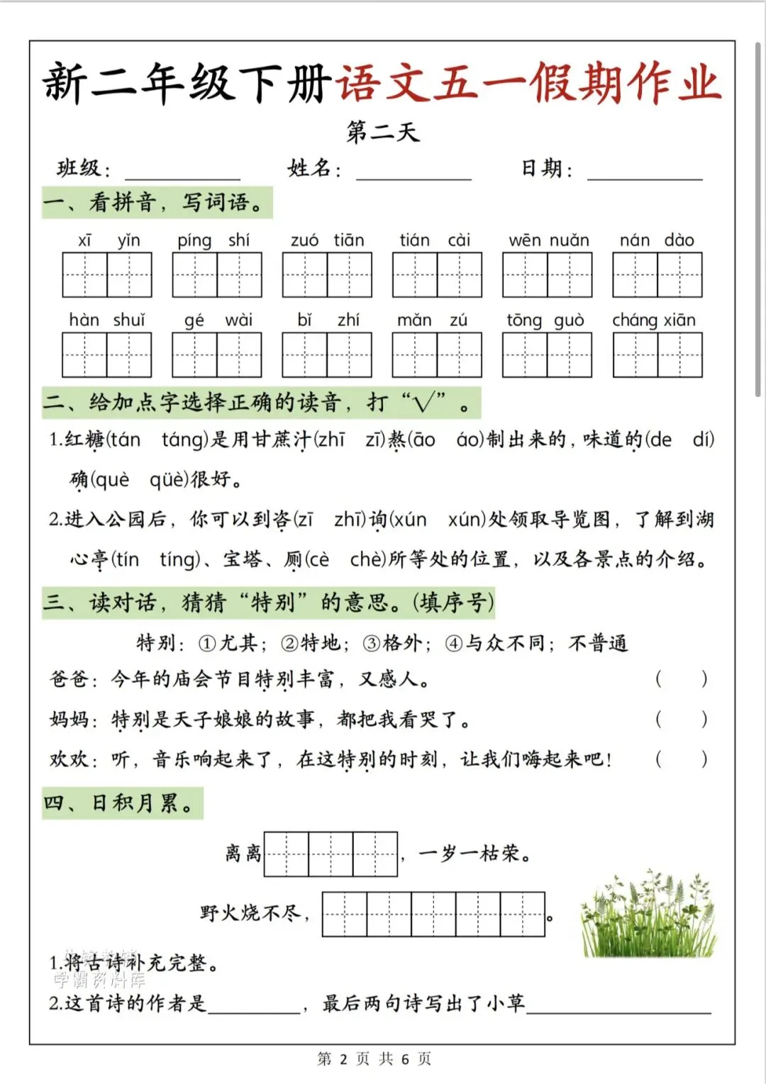 二年级下册语文五一作业(完整版含答案电子版可打印)