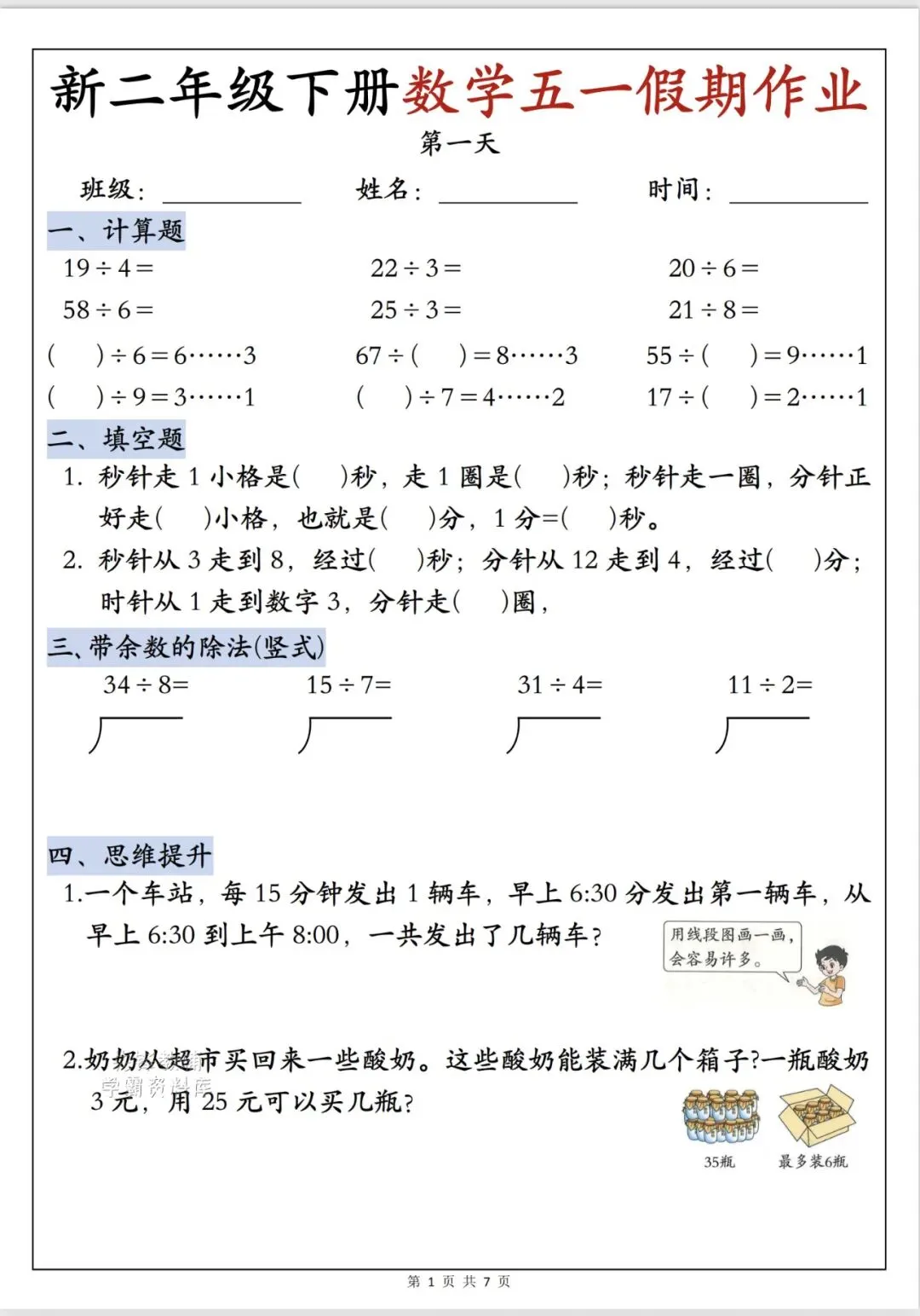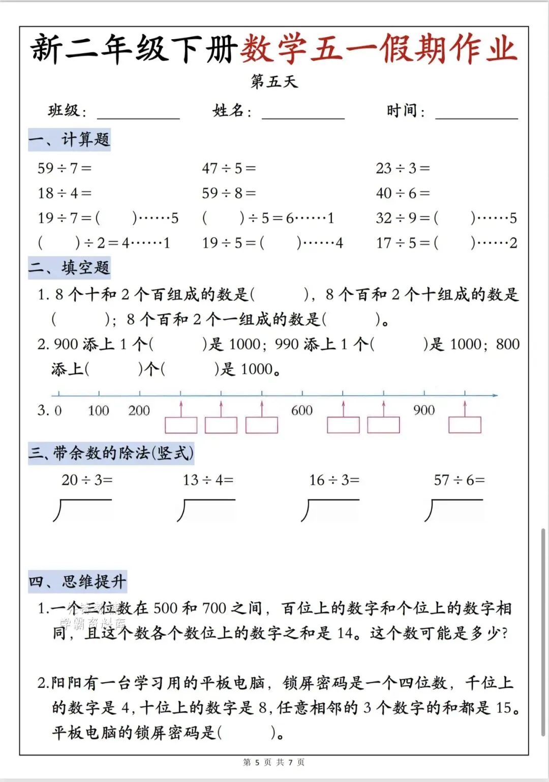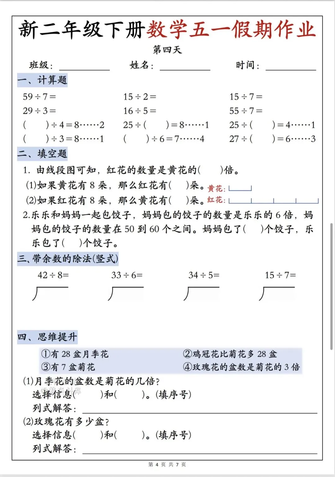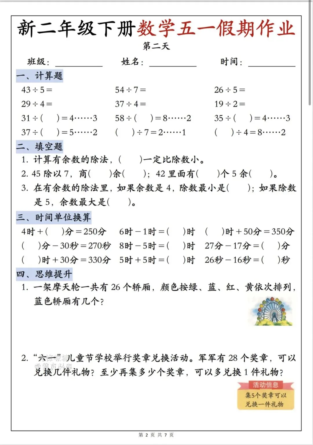 二年级下册数学五一作业(完整版含答案电子版可打印)