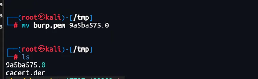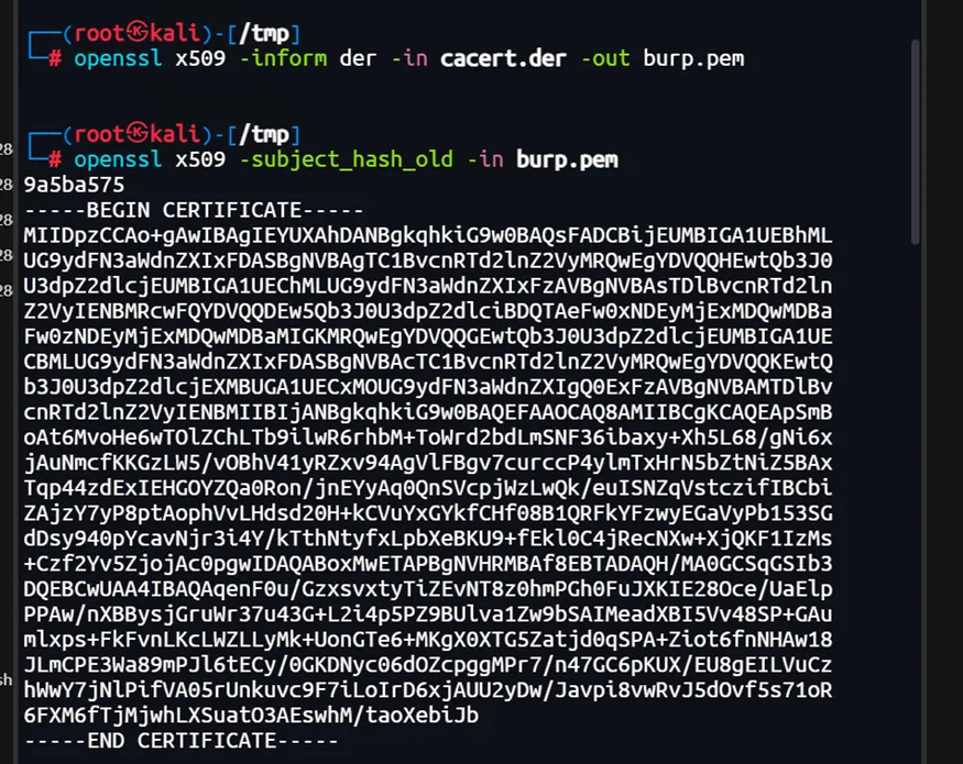 openssl x509 -inform der -in cacert.der -out burp.pemopenssl x509 -subject_hash_old -in burp.pem# 重命名证书为 9a5ba575.0mv burp.pem 9a5ba575.0