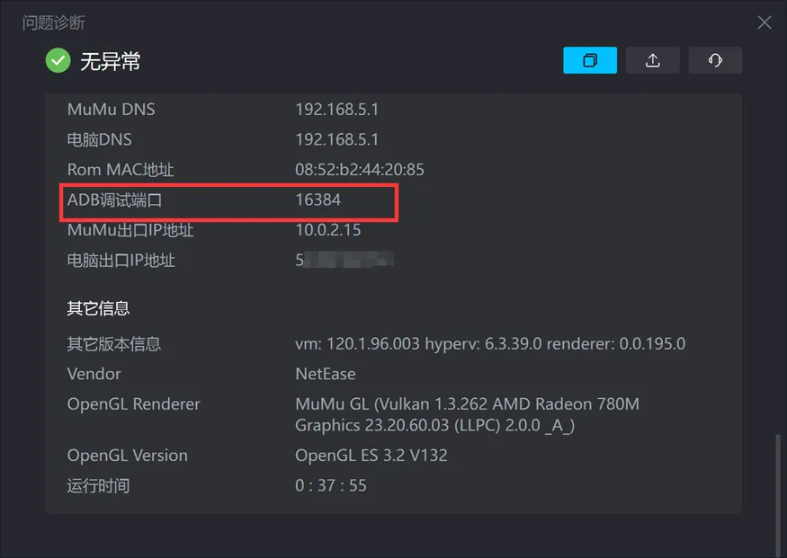 在问题诊断中查看adb调试端口: