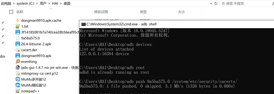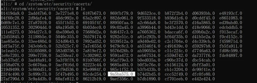 # 查看设备列表adb devices # 连接设备adb connect 127.0.0.1:16384# adb获取root权限adb root# 将当前目录下的 9a5ba575.0 复制到设备的 /system/etc/security/cacerts/ 路径下adb push 9a5ba575.0 /system/etc/security/cacerts/