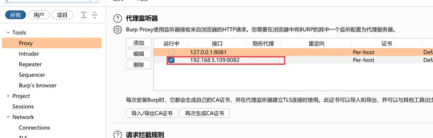 burp设置IP为内网IP,端口可自行选择,只要不被占用的。