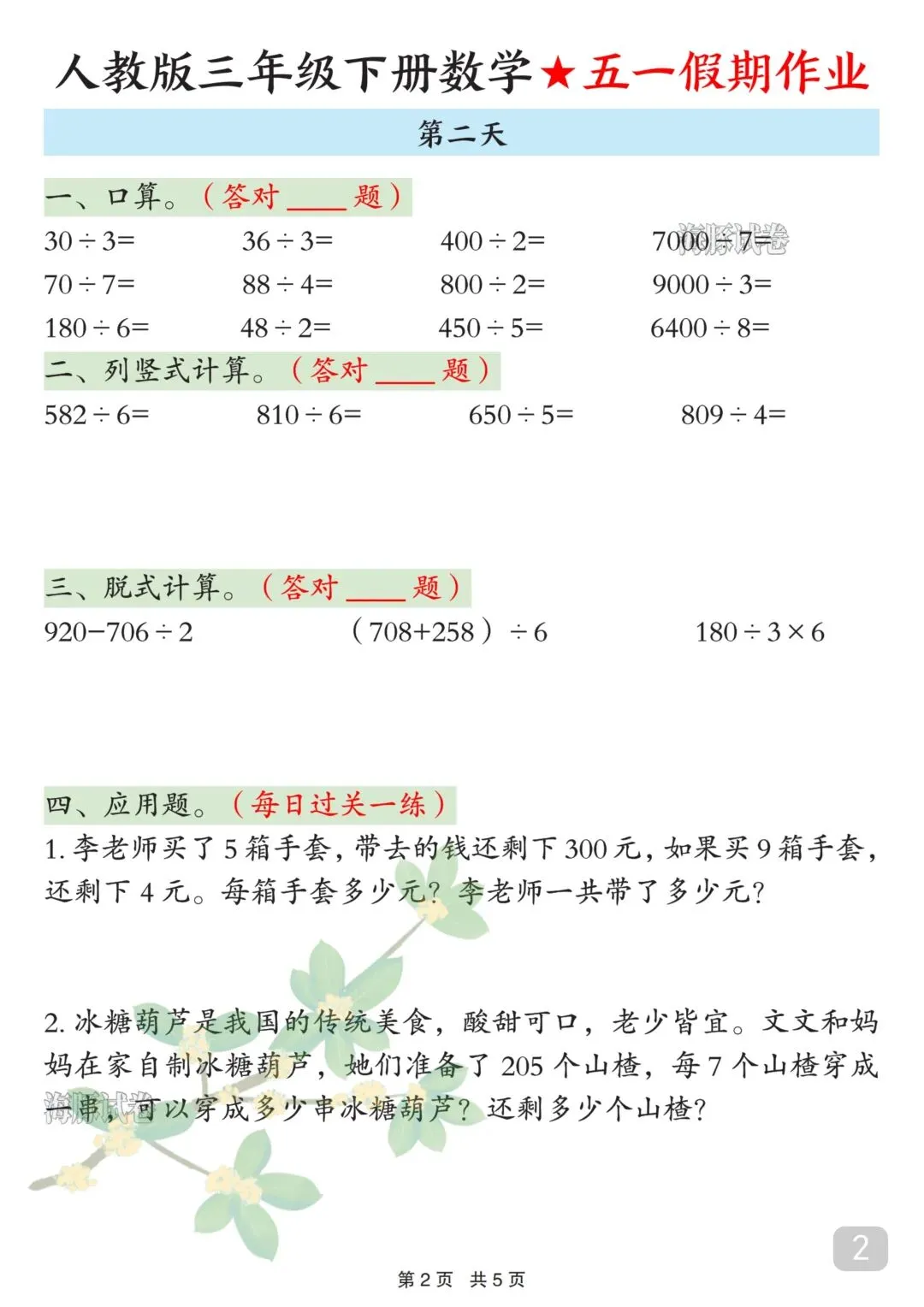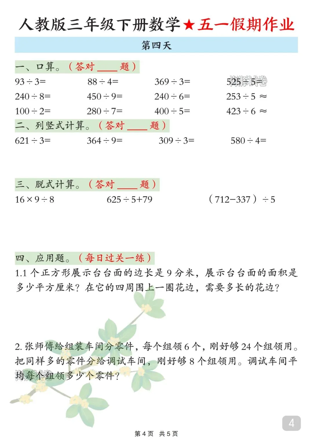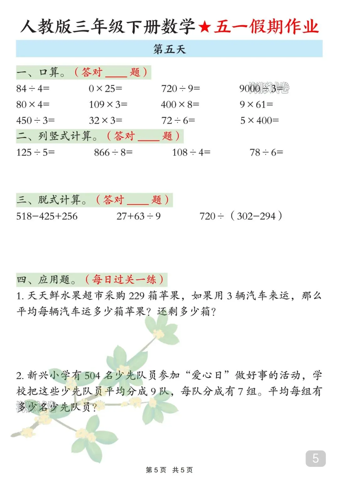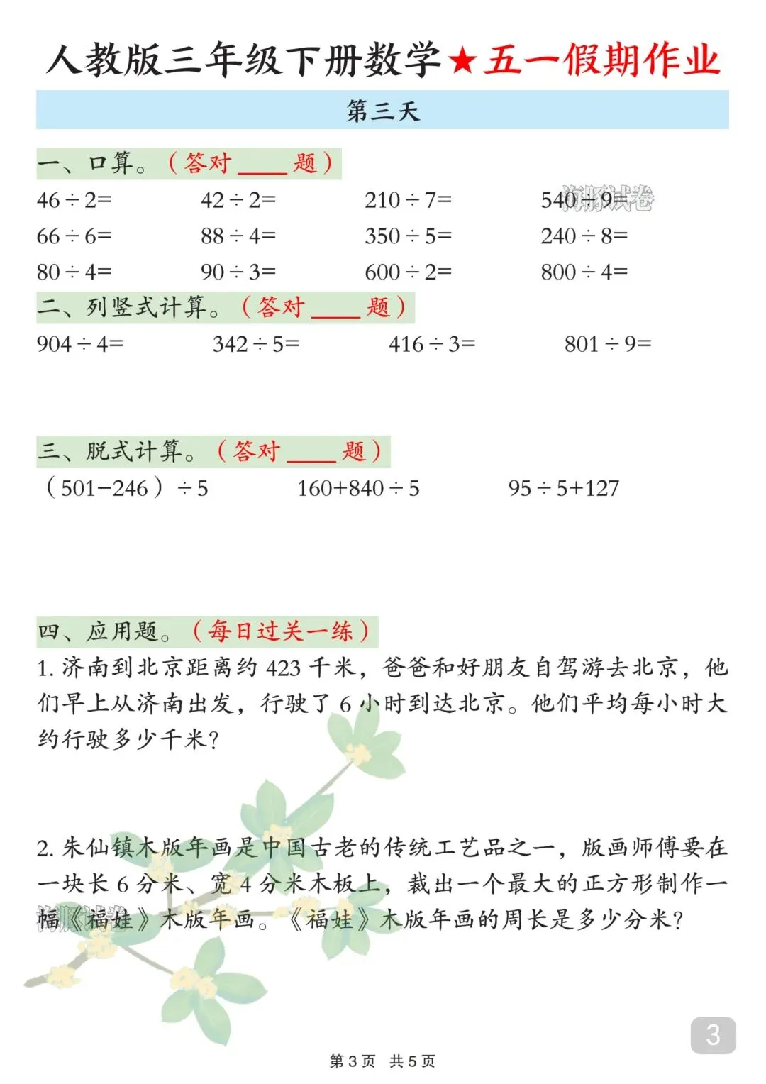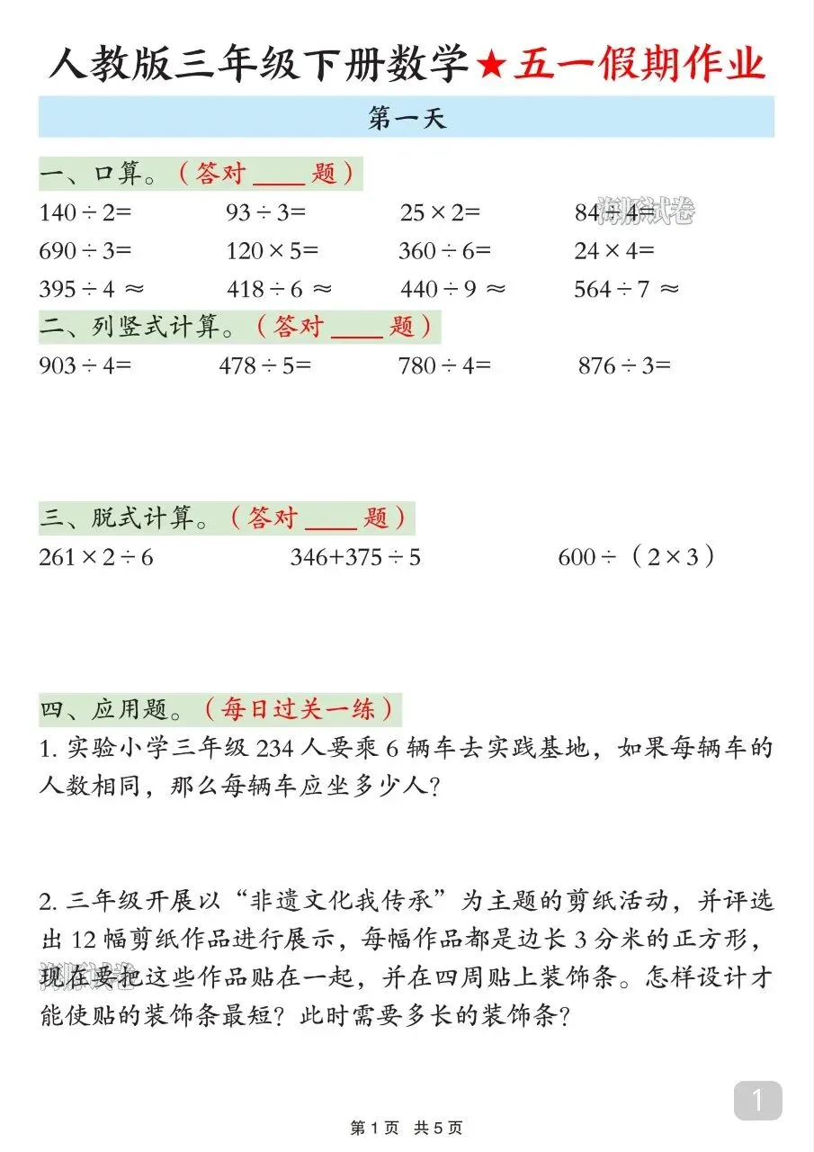 人教版三年级下册数学五一假期作业来了!5天完整版,可直接下载打印,假期学习不脱节!