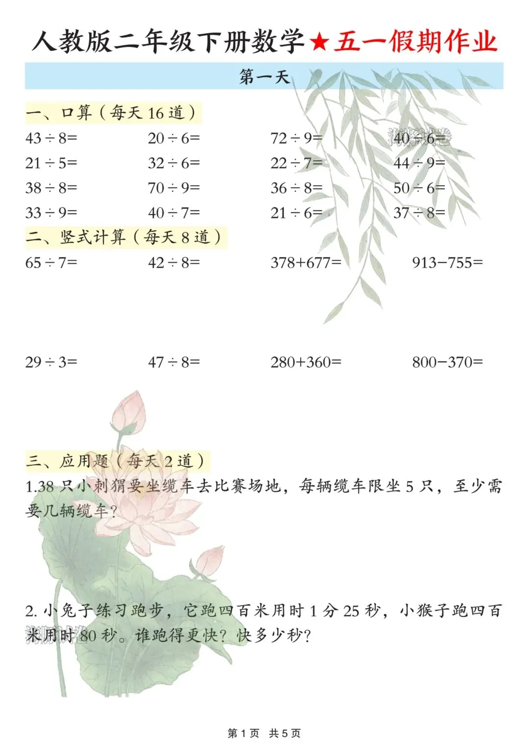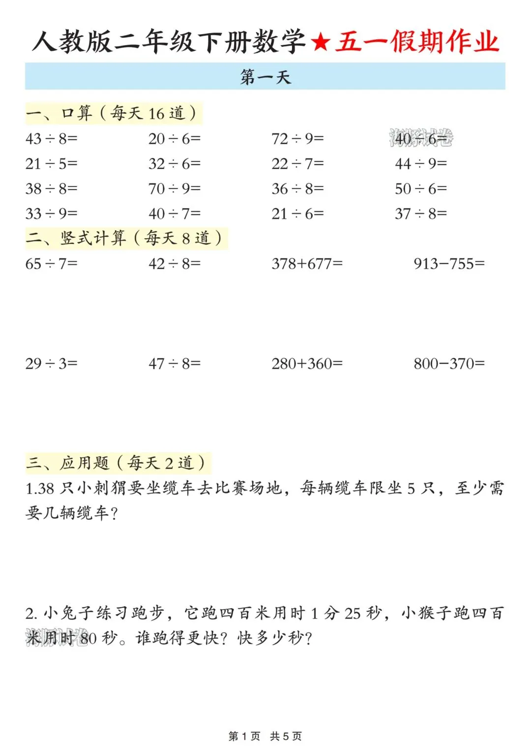 这份作业完全贴合二年级下册数学重难点,按5天打卡设计,每天1页,题量适中,不占用孩子太多休息时间: