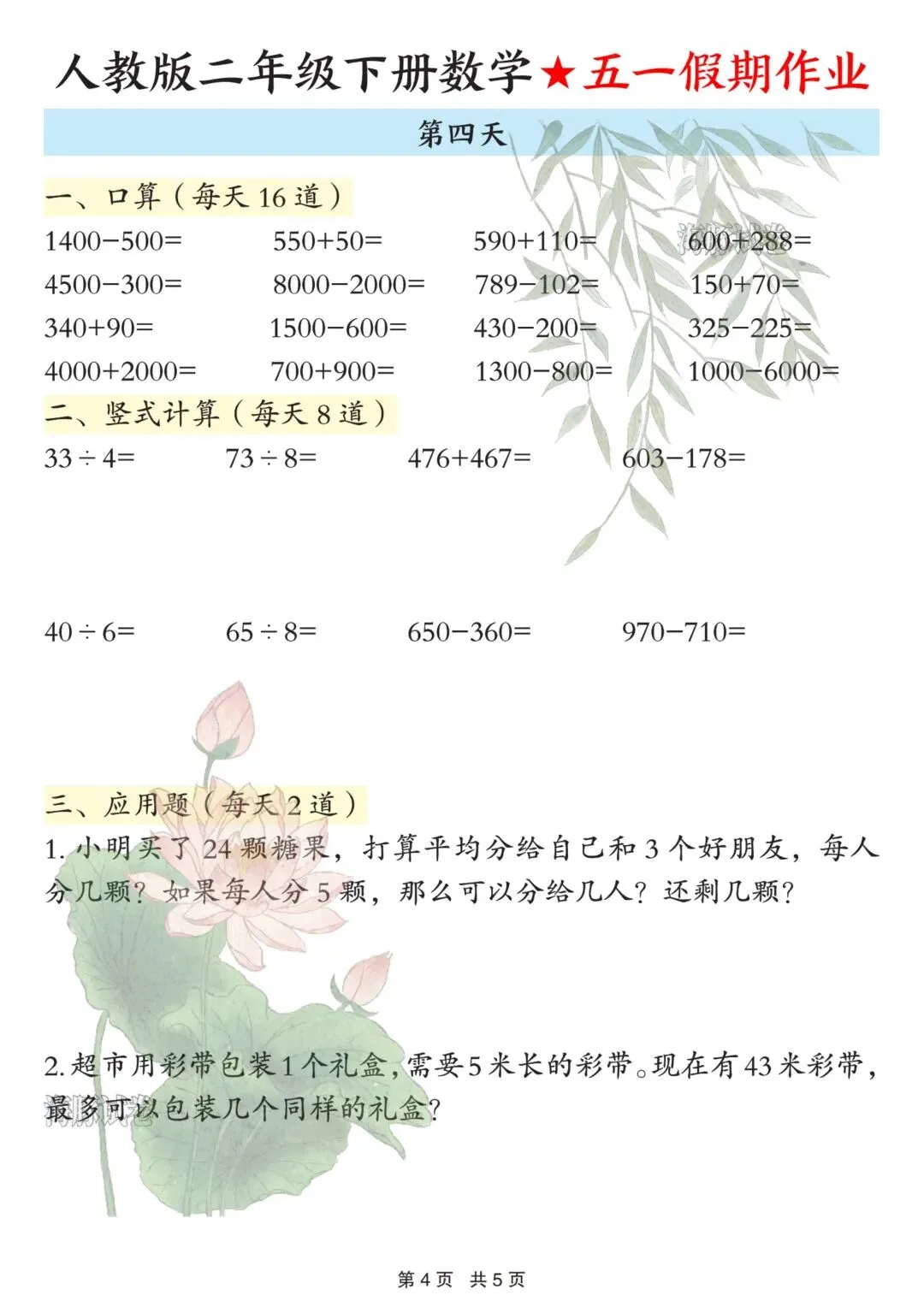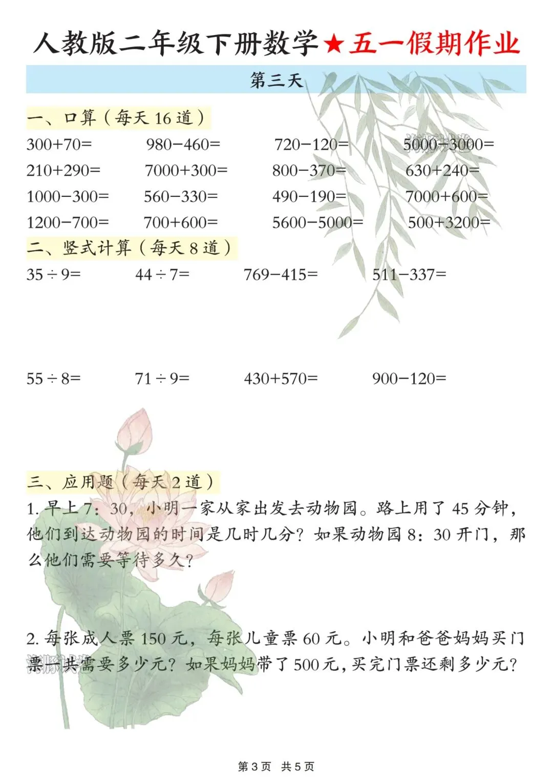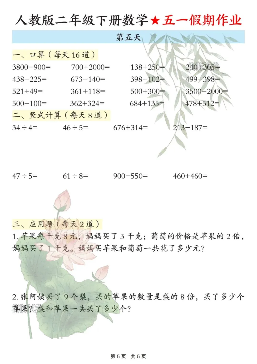 26春人教版二年级下册数学五一假期作业来啦!5天完整版,可直接下载打印,假期学习不脱节!