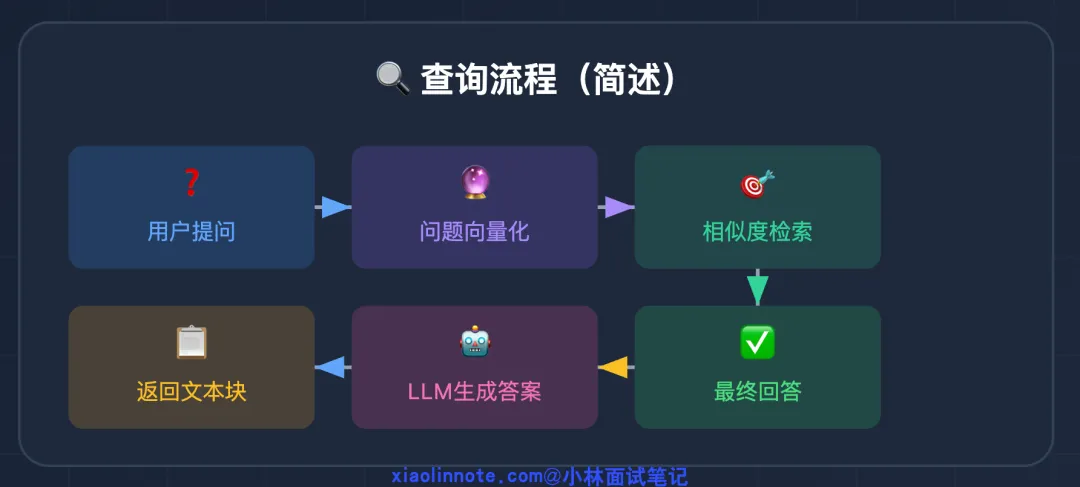 用户问题 -> 向量化 -> 在向量库里找相似的 chunk -> 取出 chunk 的原文 -> 塞进 prompt -> LLM 生成答案。向量只在「找」的时候用,LLM 最终读的是原文。