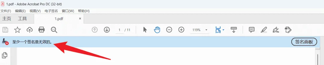 从截图可以看到,PDF 在 Adobe Acrobat Pro DC 中打开后,顶部出现明显提示:“至少一个签名是无效的。” 这类提示通常与 PDF 中的数字签名验证逻辑有关,会在阅读器中持续显示,影响正常阅览。