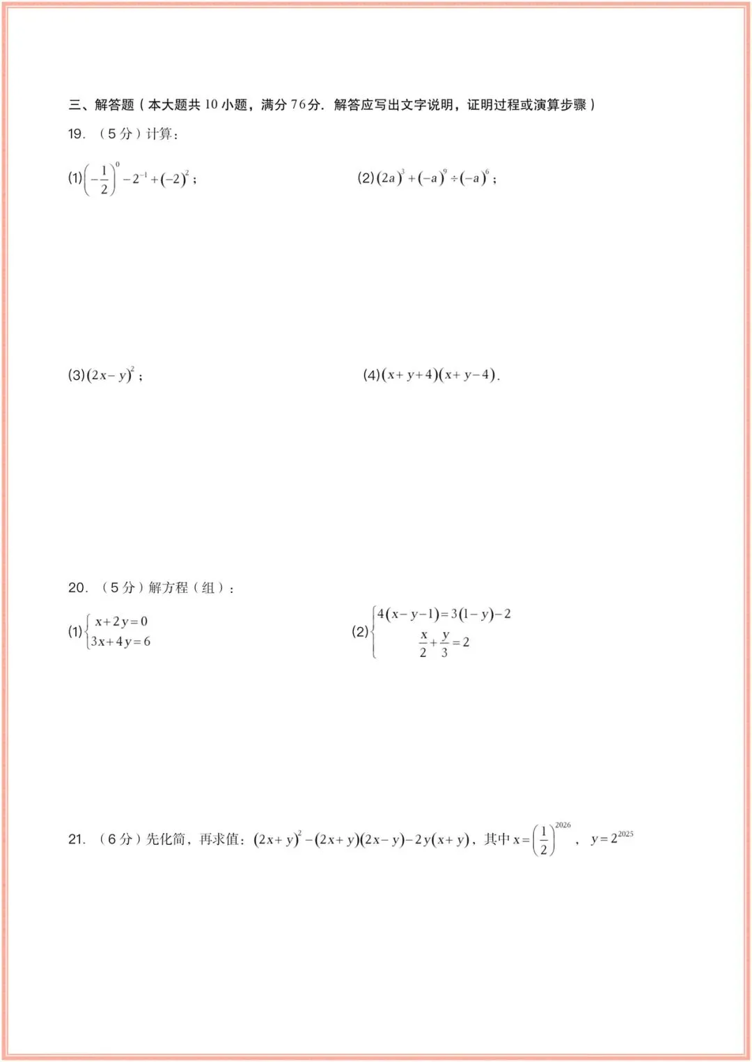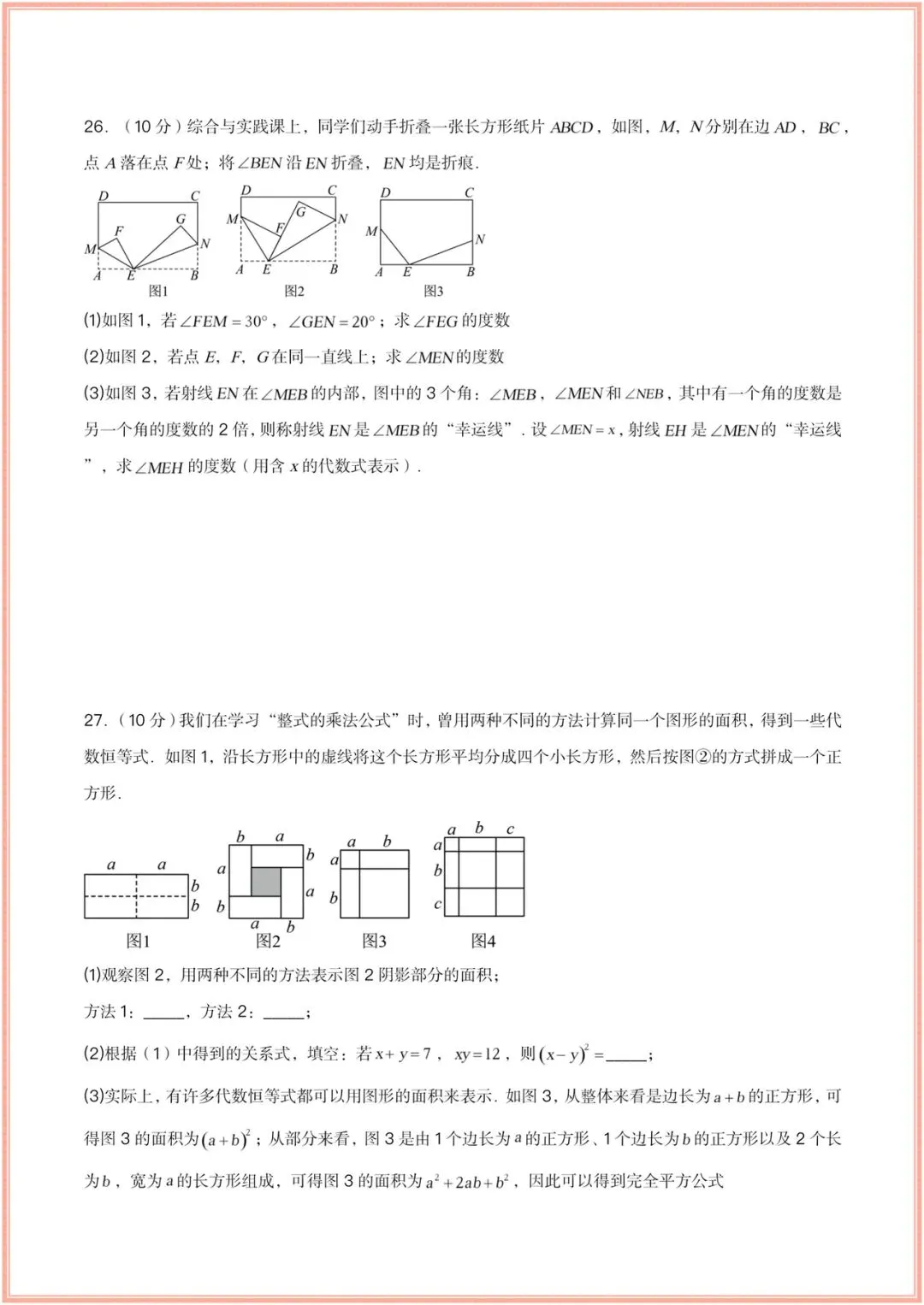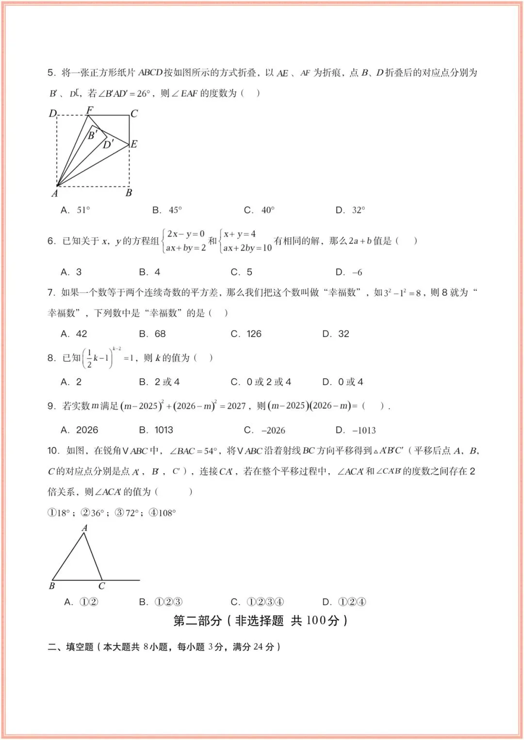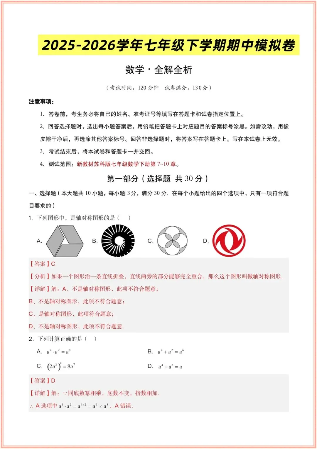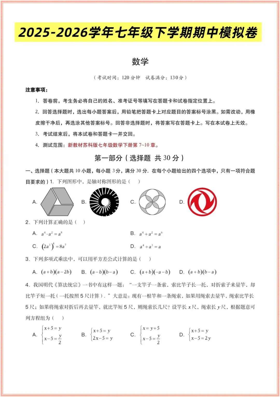 2025-2026学年(苏科版)七年级下册数学期中考试模拟卷(含答案多套),电子版可打印!
