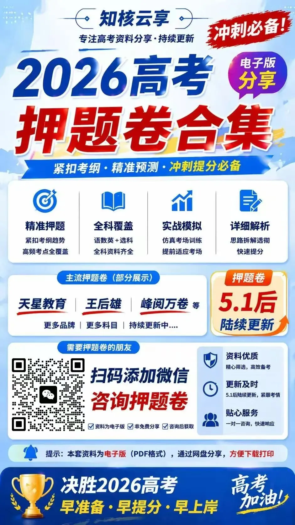 2026王后雄最新高考押题预测卷电子版重新更新中!学习资料 持续更新中!今日分享:2026王后雄最新高考押题预测卷文末点击 阅读原文 领取资料✔电子版下载方法:方法一:https://pan.quark.cn/s/73059ccb7d70(复制链接🔗浏览器打开)方法二:文末点击 阅读原文 领取资料✔方法三:扫描↓下方二维码获取更多资料 持续更新!二维码失效联系:最全资料获取防失联指南|备用联系方式合集点击下方 阅读原文 获取资料!