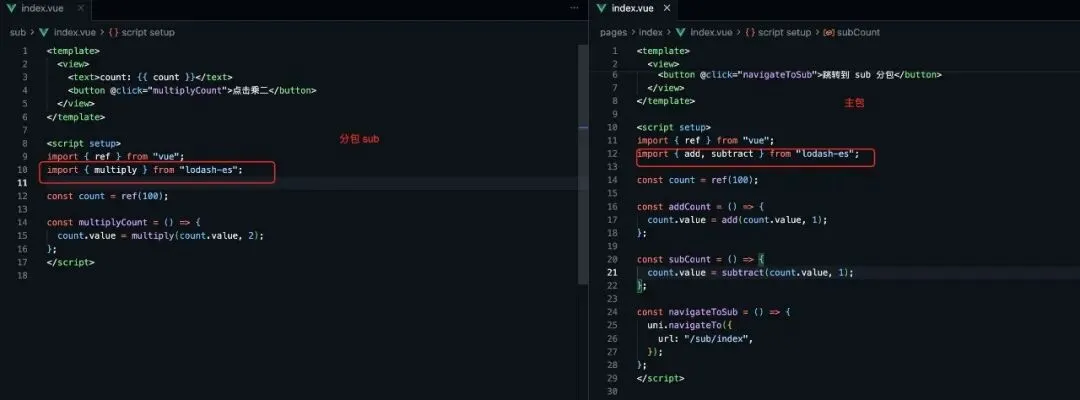 我们举一个简单的例子,主包用到了 lodash-es 的 add 和 subtract 函数,分包 sub 用到了 lodash-es 的 multiply 函数,这种分包用到的内容主包没用,就可以考虑使用这种策略,把 分包 sub 用到的 lodash-es 的 multiply 函数打包到 分包 sub 下,我们来看下 5.04 版本之前的效果