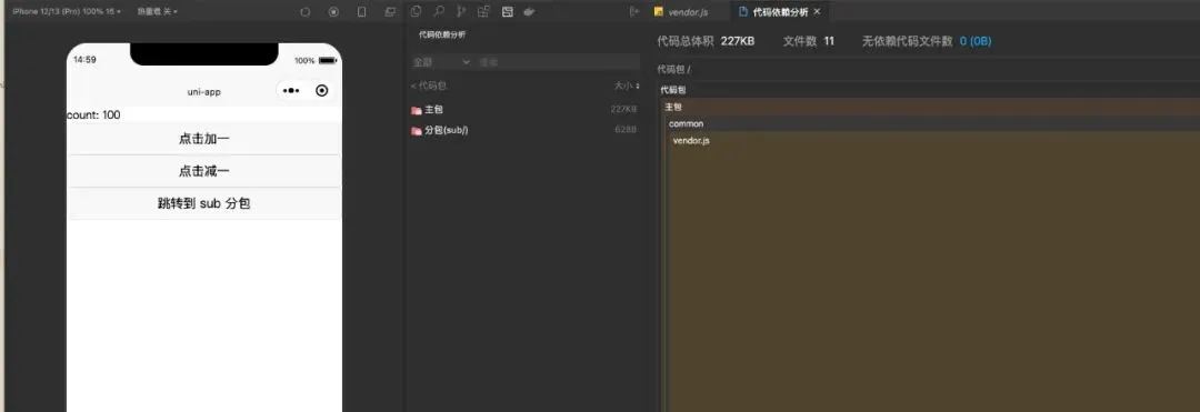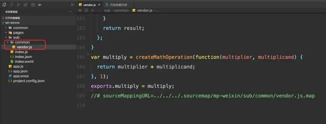 然后重新打包即可。可以看到 分包 sub 根目录下面多了 vendor.js 文件,里面就是 lodash-es 的 multiply 函数