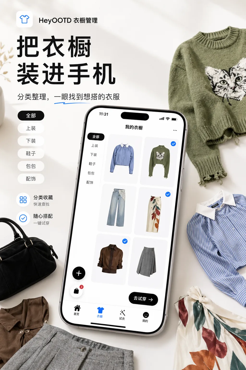 在 HeyOOTD 里,你可以把自己的衣服一件件记录下来,按照上装、下装、鞋子、包包、配饰分类整理。这样以后想找某件衣服、想看看自己有哪些单品,就不用再翻衣柜,也不用全靠记忆。