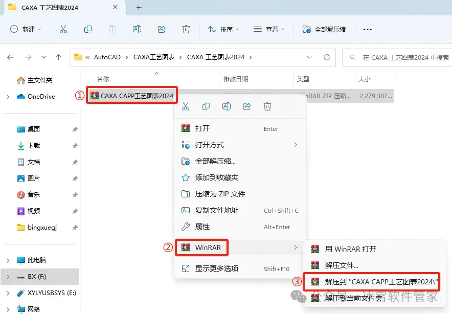 1.解压安装包:①鼠标右击【CAXA工艺图表2024】压缩包②选择电脑上的解压软件(如:WinRAR压缩)③点击【解压到 CAXA工艺图表2024】。