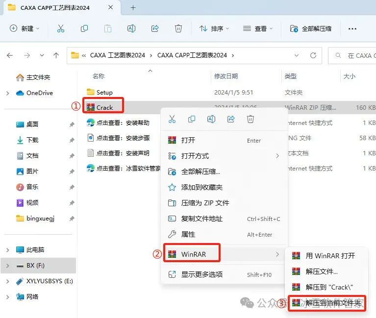 11.打开解压后的【CAXA工艺图表2024】文件夹,①鼠标右击【Crack】②选择电脑上安装的解压软件(如:WinRAR压缩)③点击【解压到当前文件夹】。