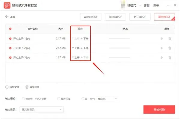 3、将需要转换的一个或多个图片文件拖入页面中,或在框内“单击”来添加文件,或点击【添加文件】按钮;添加完所需转换文件后,可点击【上移】或【下移】来调整文件顺序;