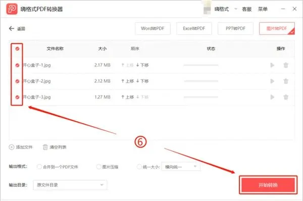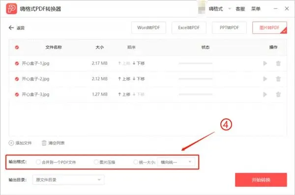 4、选择需要的输出格式——合并到一个PDF文件、图片压缩、统一大小,可多选;