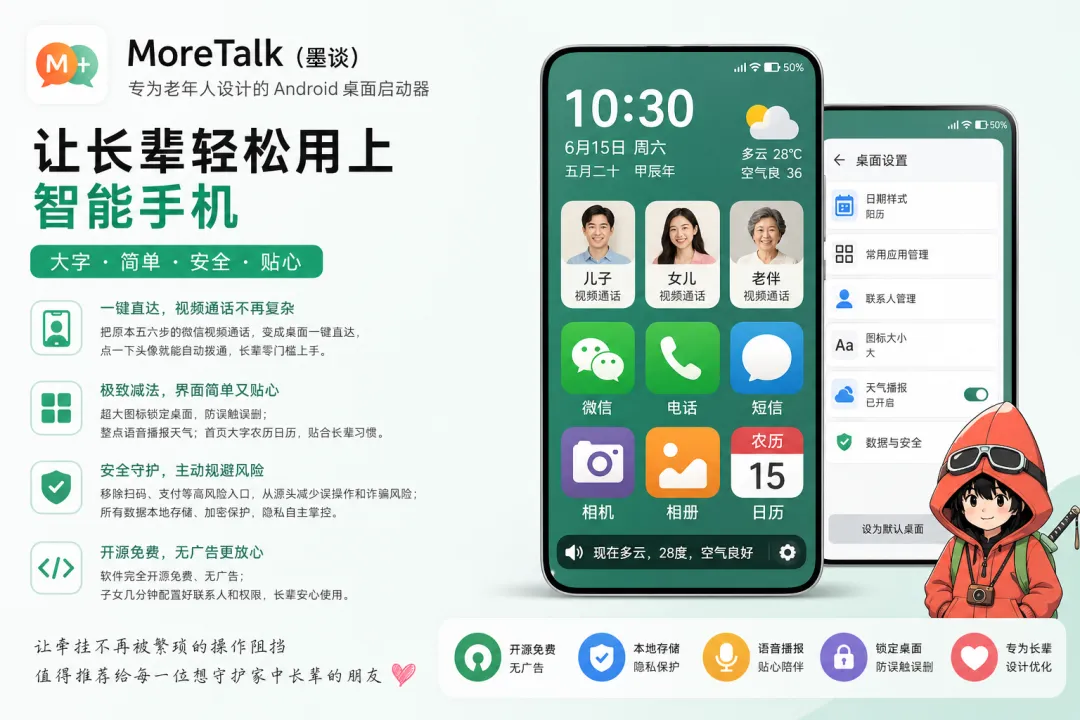 如果你也想让家里的长辈轻松用上智能手机,不妨试试 MoreTalk(墨谈) 这款专为老年人设计的 Android 桌面启动器。软件完全开源免费、无广告,初次安装只需子女花几分钟配置好联系人和权限,长辈就能零门槛上手。